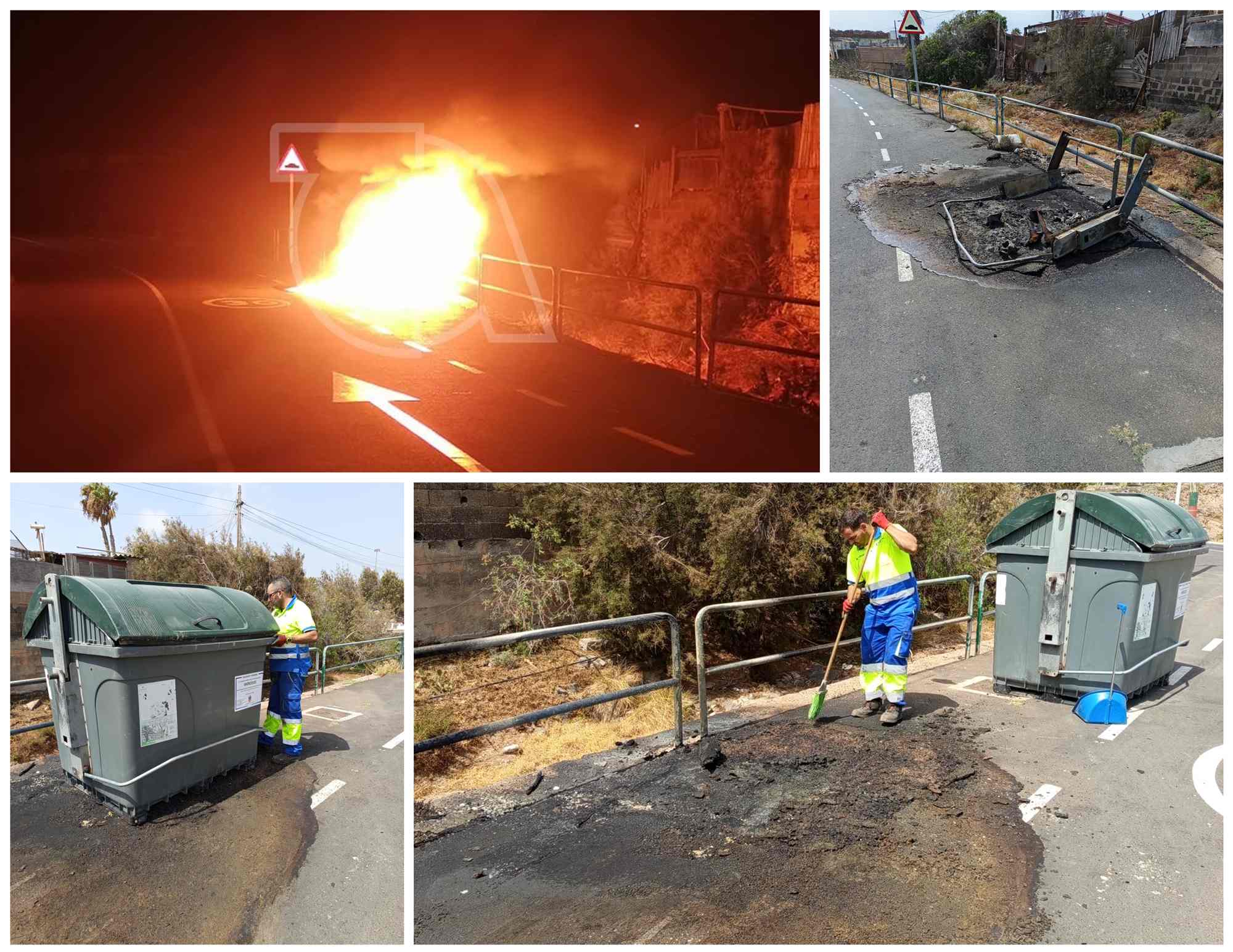 El área de Limpieza Viaria y Recogida de Residuos Sólidos del Ayuntamiento de Telde actuó con celeridad y repuso este viernes por la mañana el contenedor que había quedado completamente calcinado en la madrugada, tras un incendio intencionado en el acceso a la playa de Ojos de Garza, siniestro avanzado con imagen por TELDEACTUALIDAD.