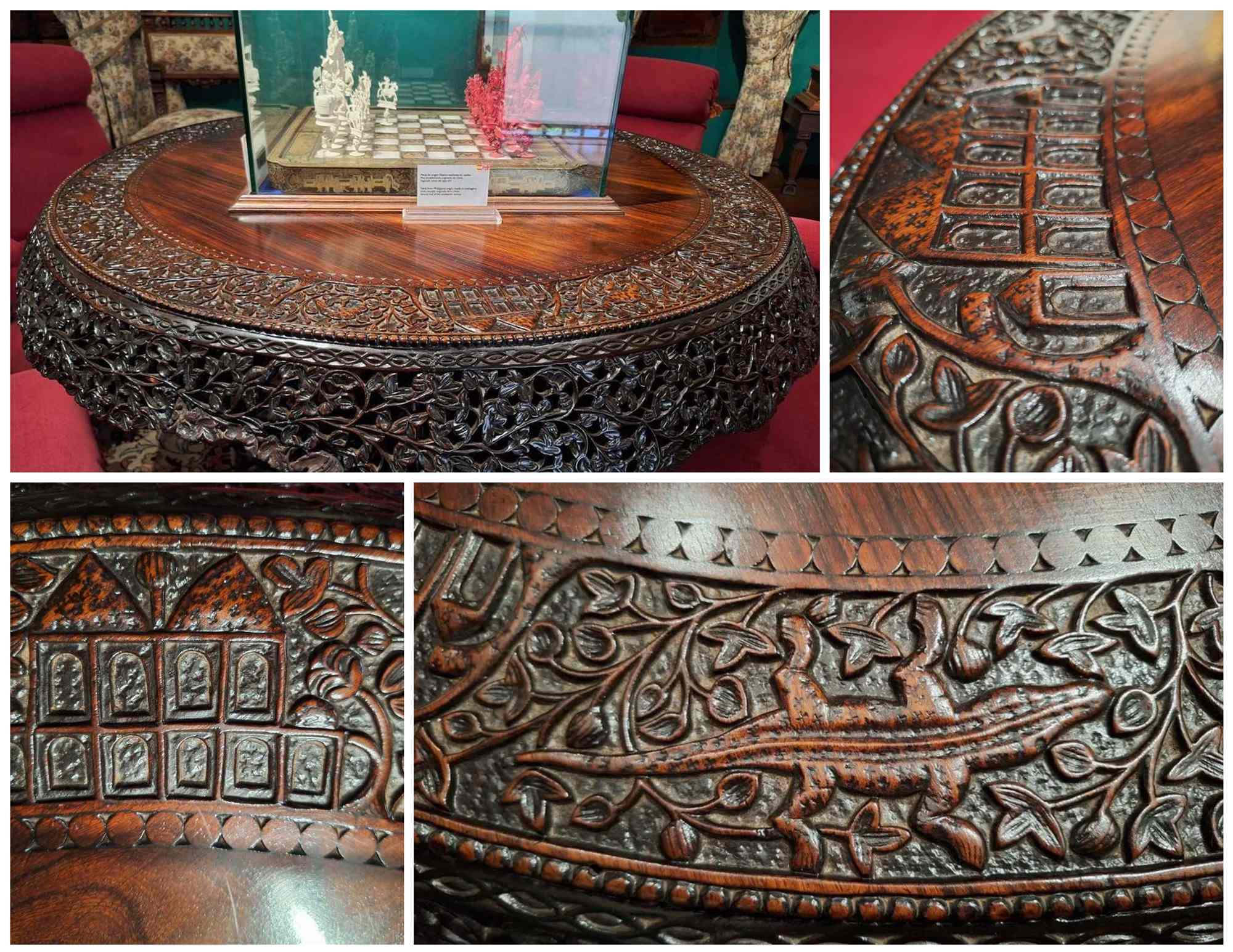 La pieza, de 76,5 centímetros de altura y 1,20 metros de largo, presenta un complejo trabajo artesanal que combina motivos vegetales, animales —como pájaros, caimanes y dragones— y arquitectónicos, en una fusión estética que refleja el encuentro entre Oriente y Occidente.