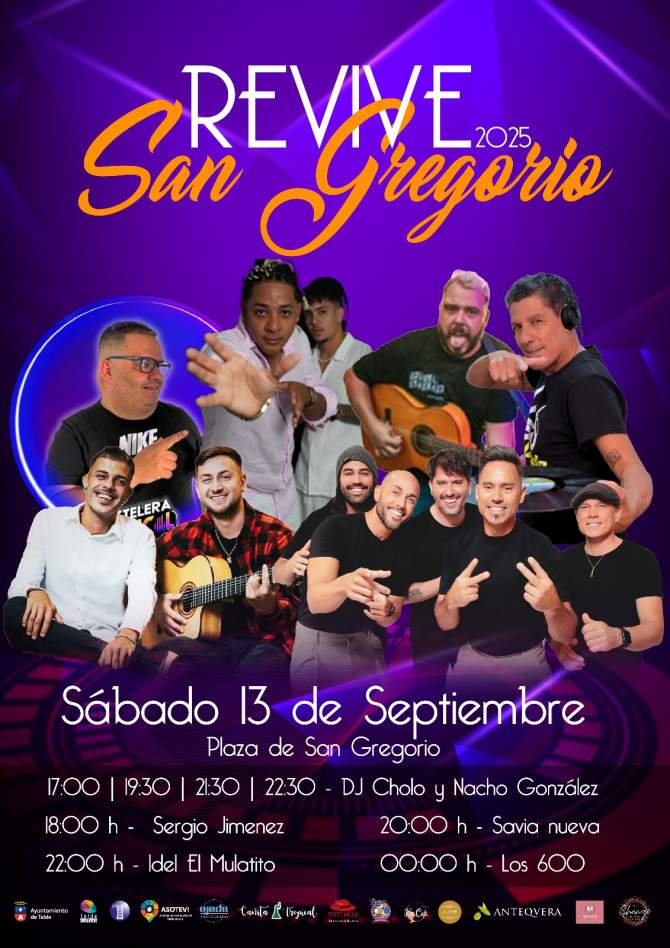 Organizado por el Ayuntamiento de Telde con la colaboración de entidades y firmas comerciales como Pastelerías Ojeda y otras), Revive San Gregorio 2025 nace con la idea de consolidarse en el calendario festivo de la ciudad, con entrada gratuita y un cartel que combina talento local y artistas de reconocido recorrido en Canarias.