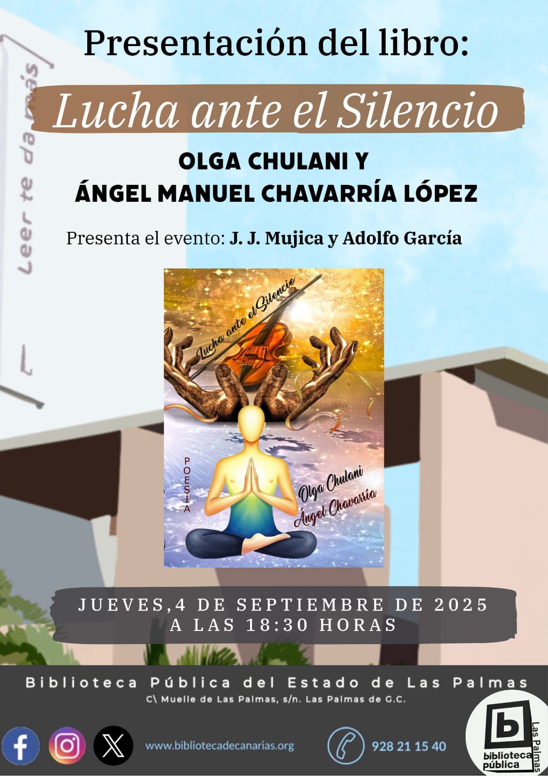 La poesía y la reflexión se dan cita este jueves 4 de septiembre, a las 18.30 horas, en la Biblioteca Pública del Estado de Las Palmas, situada en el Parque de San Telmo. Allí tendrá lugar la presentación de Lucha ante el silencio, el primer libro escrito en conjunto por Olga Chulani y Ángel Manuel Chavarría López.