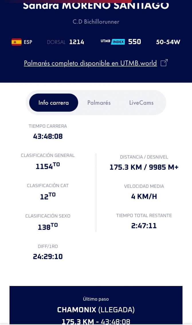 Y no es cualquier cosa esto; Recorrió más de 177 Km. En la Ultra Trail del Montblanc, que está considerada como una de las más exigentes del mundo. Esta prueba, enmarcada en el Campeonato Mundial de Trail Running, es de las más exclusivas en el mundo runner, no sólo por la cantidad de deportistas que participan, sino porque, además, concentra a los mejores corredores del mundo en esta especialidad.