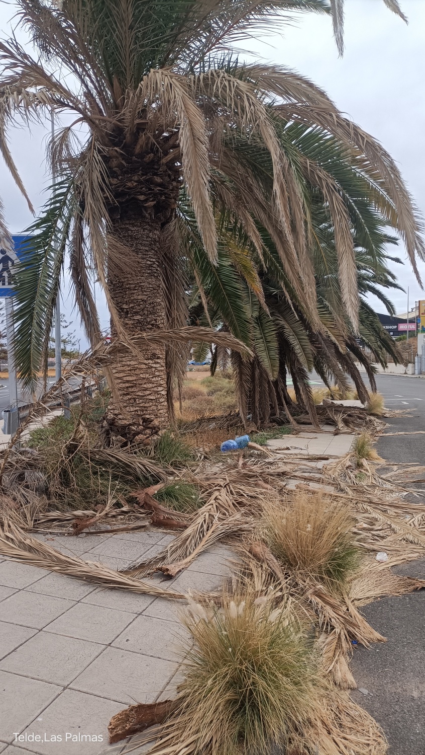Cuando el abandono es mayúsculo, y este es el caso, no es necesario ni siquiera entrar en el polígono industrial. La vía de circunvalación que une la GC-1 con la zona costera de Salinetas y otras playas de Telde, presenta una lamentable imagen. El rabo de gato ha colonizado ambas márgenes de las vías, desarrollándose con enorme fuerza, sin que nadie durante meses le haya puesto freno. Esto ha llevado a la planta invasora a gozar de una estupenda floración y poder generar millones de semillas que se han esparcido con el viento sin problema alguno, permitiéndole garantizar la colonización de toda la costa, algo que la planta ha llevado a cabo sin descanso. Pero no sólo eso, sino que su presencia ocultando por completo la línea de las aceras e invadiendo parte del carril derecho, genera un peligro continuo al tráfico rodado. Además, su parte aérea ahora totalmente seca, se ha convertido en un potencial vector de propagación del fuego -así me lo han manifestado vecinos de la zona cuando me los encuentro caminando por esta ví. Un vector de fuego -dicen-, que encontraría un campo propicio para propagarse en tantas hojas secas como hay, de palmeras canarias, palmeras que languidecen, están en las últimas y mueren no sólo en la margen derecha de la carretera sino por todo el borde de la urbanización industrial que limita con el barranco de Silva donde más del cincuenta por ciento de las que había se han secado ya.
