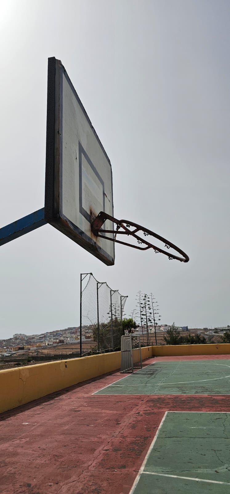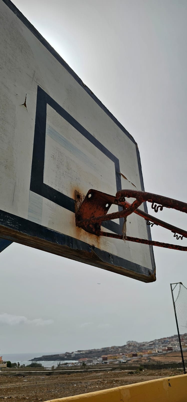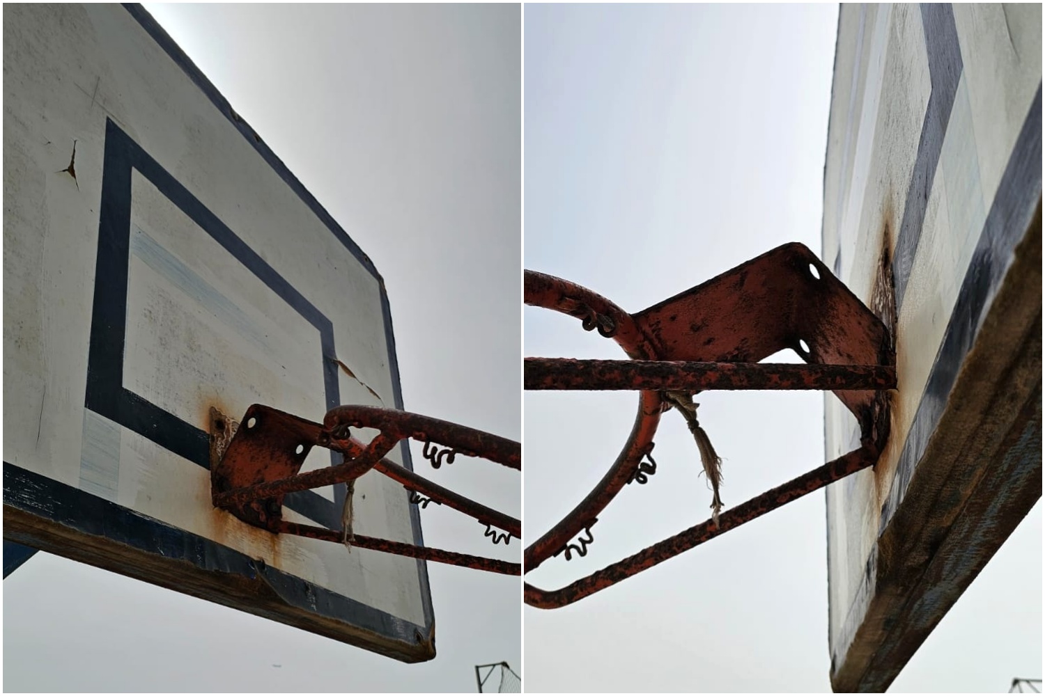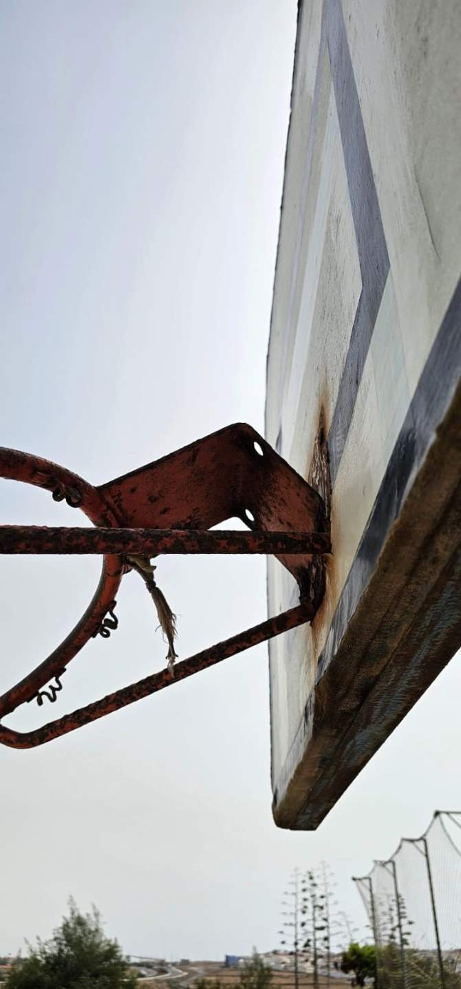 Las imágenes muestran manchas de óxido alrededor de la base de sujeción de los aros, que se mantienen fijados por unos tornillos corroídos. El metal del aro está visiblemente oxidado y deformado, con partes retorcidas y secciones partidas, lo que impide que conserve la forma circular adecuada. En algunos puntos, la pintura se ha desprendido por completo. Además, se observan grietas en el tablero y zonas con desprendimientos de material. Los usuarios de la cancha aseguran que ambas canastas se encuentran en condiciones similares.