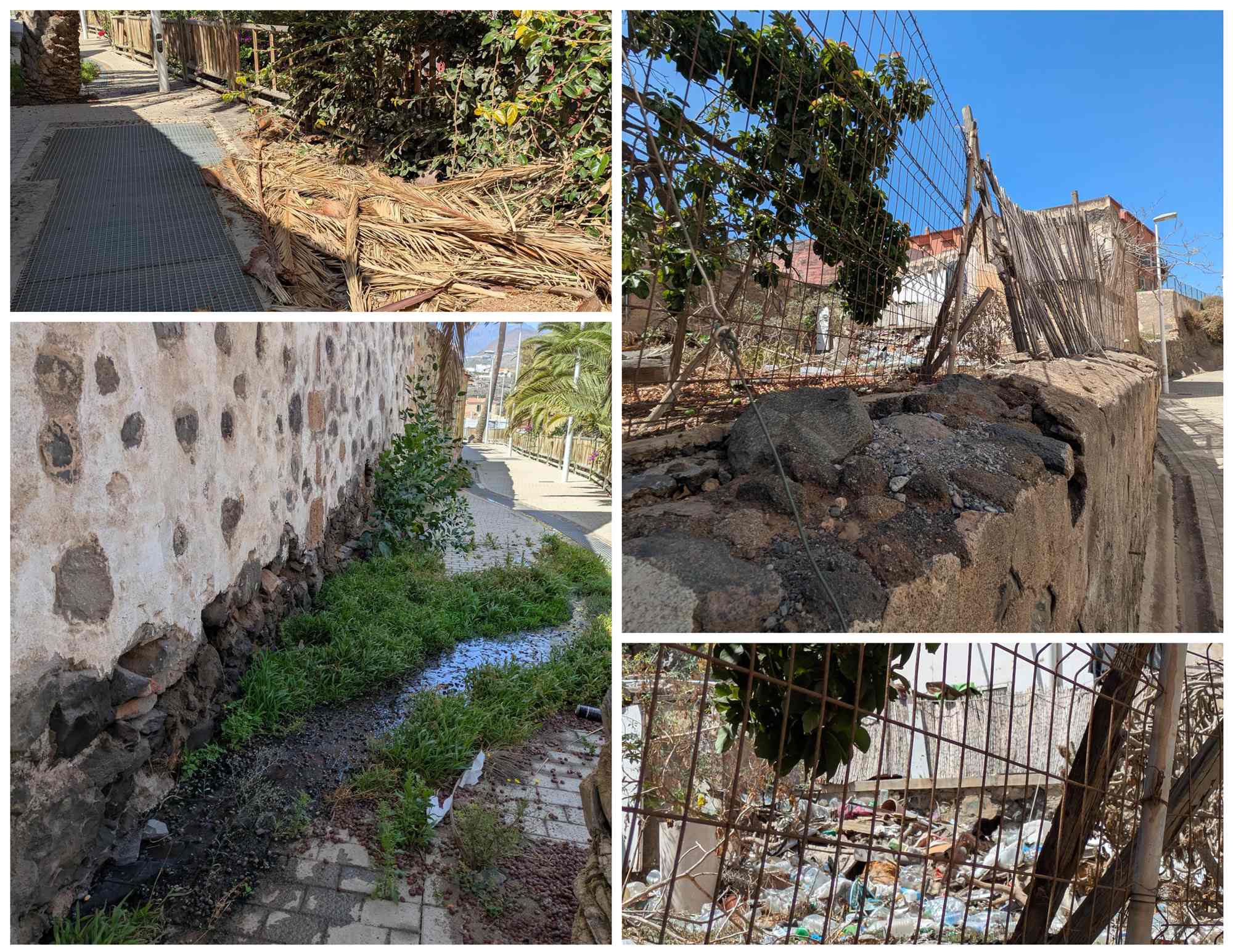 En las imágenes remitidas a TELDEACTUALIDAD se aprecia el vertido constante de aguas residuales que humedecen el muro del paseo y generan charcos pestilentes; la acumulación de ramas secas y hojas de palmera sobre las aceras, que suponen además un riesgo de incendio, y un solar próximo colmatado de botellas de plástico, escombros y desperdicios, convertido en basurero improvisado.