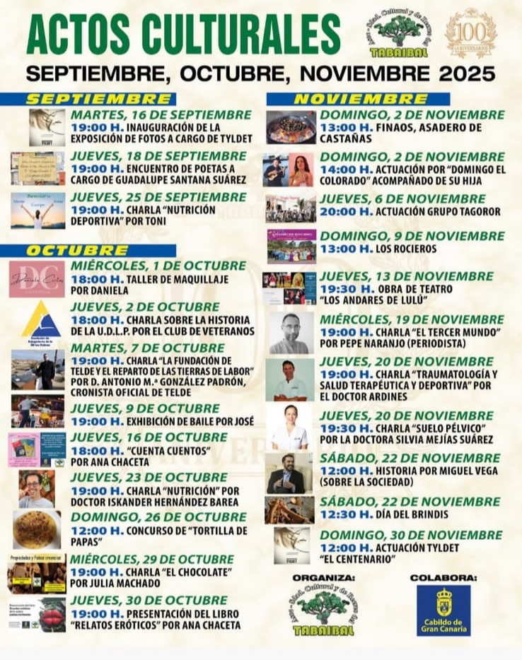 La Sociedad de Cultura y Recreo El Tabaibal, fundada en 1925 en el barrio teldense de San Antonio, celebra este año su 100 aniversario con un programa especial de actividades que se extenderá durante los meses de septiembre, octubre y noviembre. La sede, ubicada en la calle Enrique Granados, acogerá charlas, talleres, concursos, actuaciones musicales y encuentros culturales que subrayan la vitalidad de esta histórica entidad.