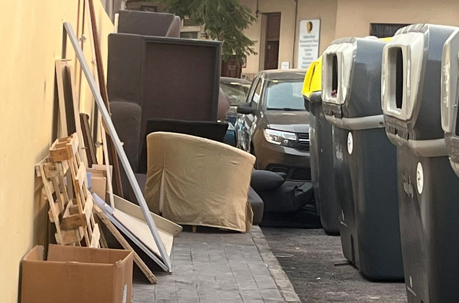 Vecinos y viandantes de la calle Doctor Gutiérrez Armario, en pleno San Gregorio, han denunciado la acumulación de muebles y enseres de gran tamaño junto a los contenedores de basura, en las inmediaciones del Centro de la Tercera Edad de Telde.