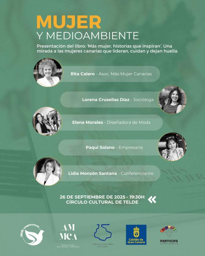 El colectivo Turcón-Ecologistas en Acción traerá a Telde el próximo viernes 26 de septiembre la presentación del libro Más Mujer, historias que inspiran, una obra que reúne las experiencias de 21 mujeres canarias comprometidas con el medio ambiente, el liderazgo y el desarrollo sostenible. La cita tendrá lugar a las 19.30 horas en el Círculo Cultural, con entrada libre y gratuita.