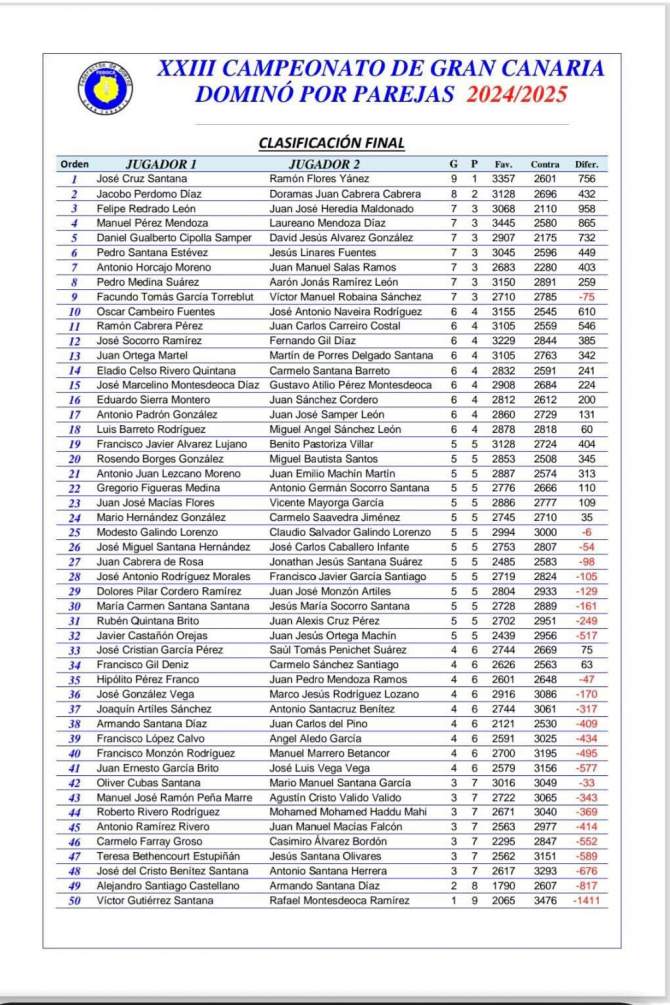 Los teldenses José Cruz Santana y Ramón Flores Yánez se proclamaron vencedores en el XXIII Campeonato de Gran Canaria 2025 de Dominó por Parejas, que se disputó en Teror los pasados 13 y 14 de septiembre.