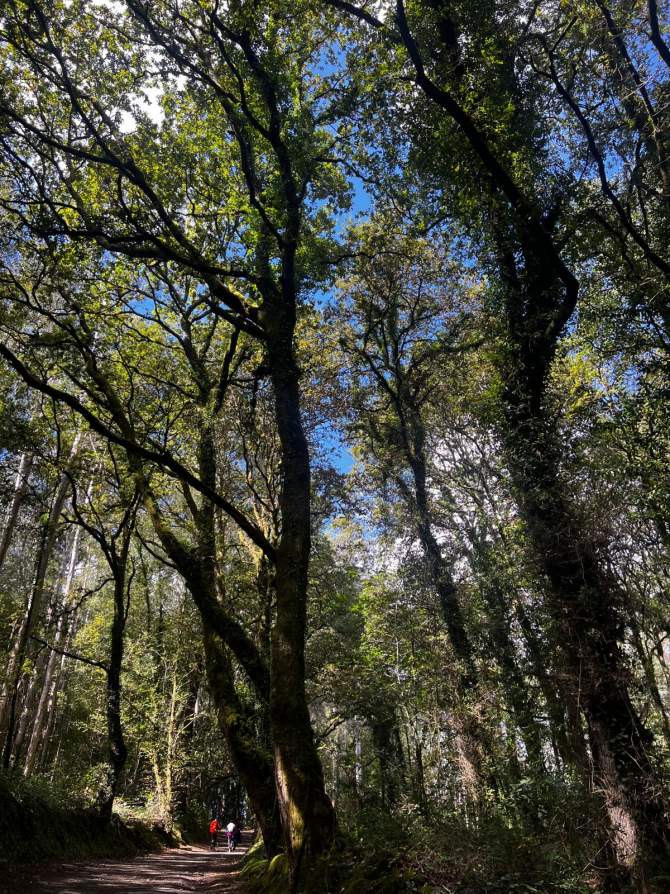 Y el Camino fluye, marea humana a veces, peregrinos y caminantes siempre, bajo el dosel arbóreo de robles y castaños.
