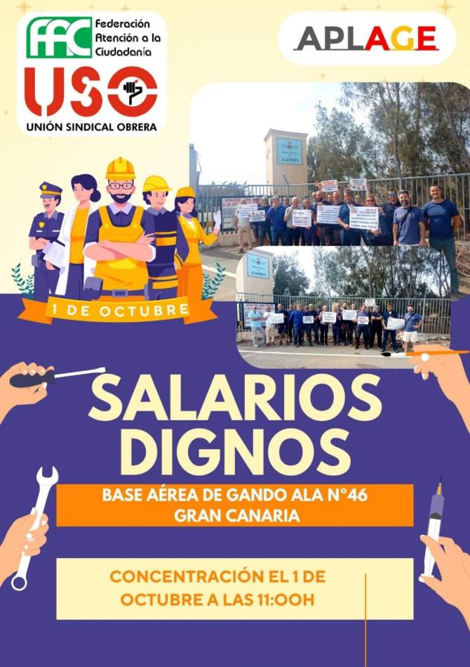 La Unión Sindical Obrera (USO) ha convocado para este miércoles de 11.00 a 11.30 horas una concentración en la Base Aérea de Gando en el marco de una jornada de movilizaciones que se desarrollará de forma simultánea en 48 centros militares de toda España.