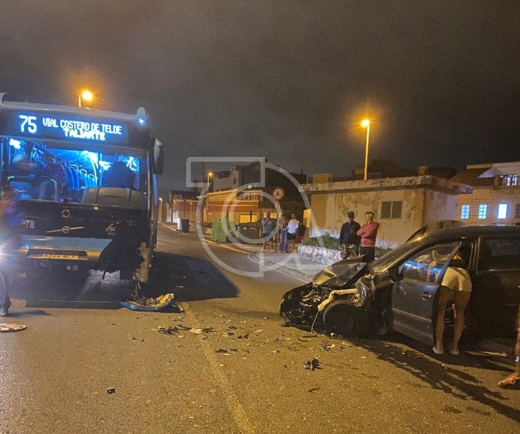 El suceso se saldó con dos heridos de carácter leve, una mujer que iba en la parte trasera del turismo y quedó atrapada en él teniendo que ser resctada por bomberos del parque zonal de Telde, y uno del autobús.