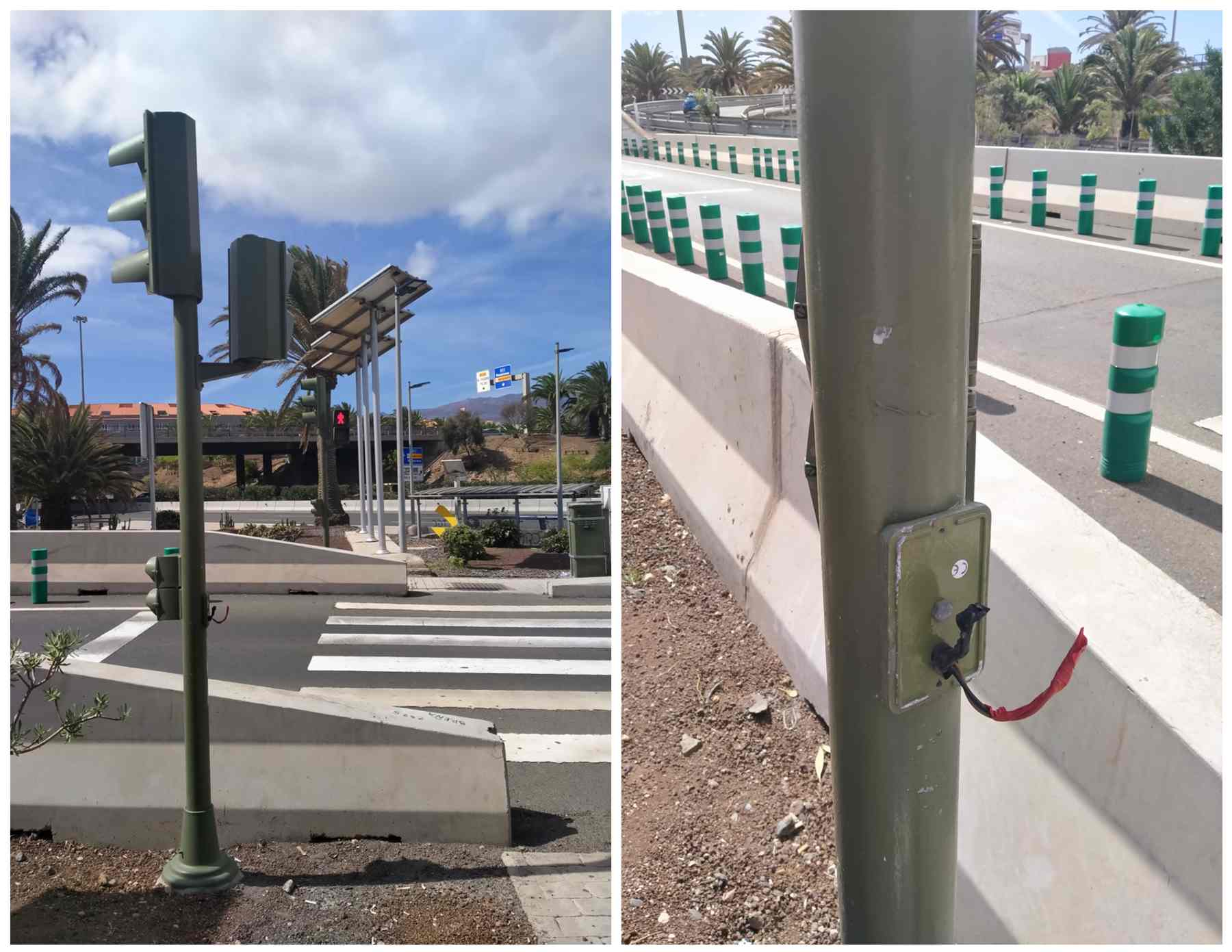 Las imágenes remitidas a TELDEACTUALIDAD muestran el botón con los cables al aire y cubiertos con cinta aislante, lo que impide que los peatones puedan activar la señal de cruce. Esta situación genera un serio peligro para las personas que intentan atravesar la vía para dirigirse a la parada de guaguas de Global, situada al otro lado de la carretera, junto a la GC-1 en dirección norte.
