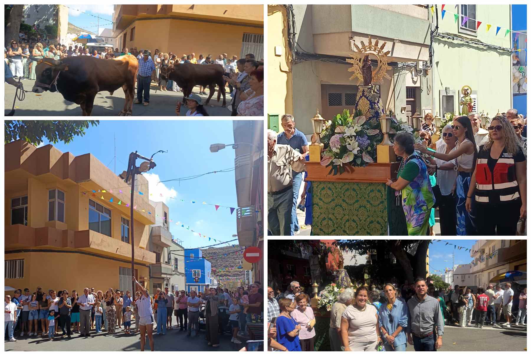 La celebración comenzó a primera hora con la apertura de la Feria de Ganado Local, que atrajo a numerosos vecinos y curiosos interesados en conocer de cerca el valor del sector primario y las tradiciones rurales que siguen vivas en la zona. A las 12.00 horas se celebró la Santa Misa en honor de la patrona, uno de los actos más solemnes de la jornada. La eucaristía oficiada por el párroco Ricardo Miranda estuvo amenizada por los monitores de la Escuela Municipal de Folclore de Telde.