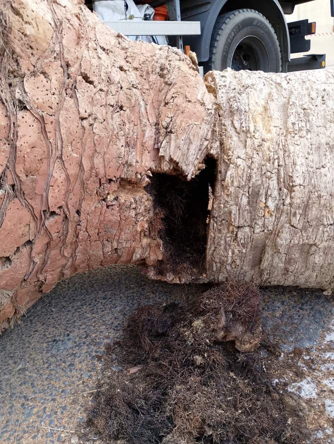 El Ayuntamiento ha actuado desde el rigor y el compromiso con la seguridad, ante una situación de peligro, protegiendo a los usuarios y al propio patrimonio. El consistorio lamenta verse obligado a retirar estas dos palmeras, pero su oquedad y mal estado determinaron que tarde o temprano terminarían cediendo.