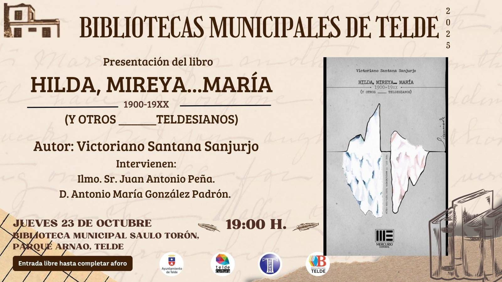La Biblioteca Municipal Saulo Torón de Telde acogerá el próximo jueves 23 de octubre, a las 19.00 horas, la presentación del nuevo libro del escritor e investigador Victoriano Santana Sanjurjo, titulado Hilda, Mireya… María (1900-19XX) (y otros teldesianos). La cita cultural, de entrada libre hasta completar aforo, reunirá a lectores, historiadores y amantes de la memoria local en el corazón del Parque Arnao.