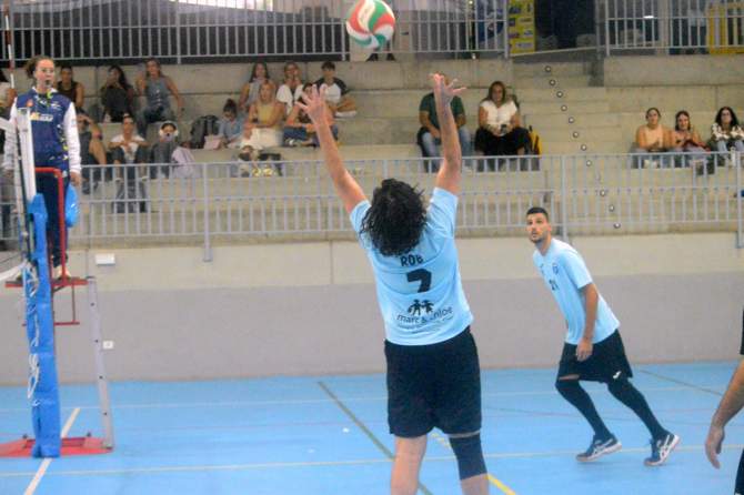 Momento del encuentro en el que el líbero intenta una recepción (Foto: Juan Antonio Hernández)El CD Alhambra Axinámar perdió este sábado por 0-3 (13-25, 17-25 y 18-25, hora y cuarto de partido) ante el CV SUAC Canarias en el pabellón Juan Carlos Hernández en la jornada inaugurar de la Liga Canaria Sénior.