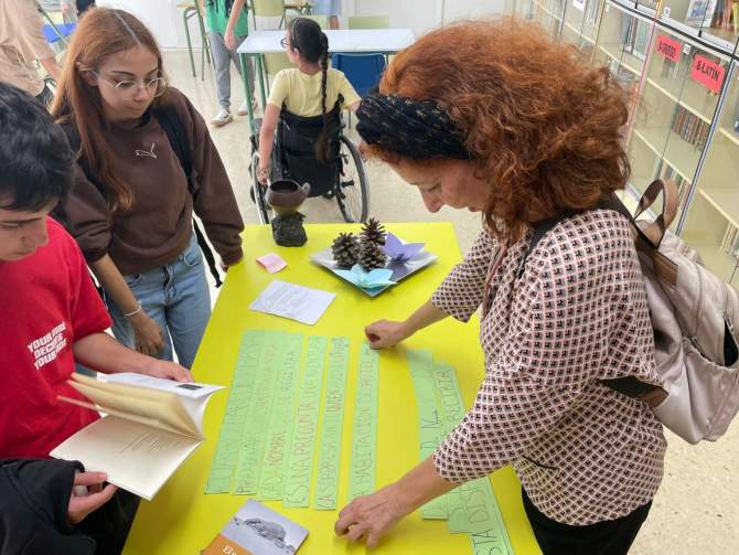 Con el alumnado de 3º de ESO, la actividad incluyó el análisis del poemario Habitación 241 mediante la metodología Visual Thinking Strategies (VTS), que combina observación e interpretación visual. El grupo, acompañado por la docente Ana Ramírez Reina, elaboró mapas conceptuales sobre los poemas del libro.