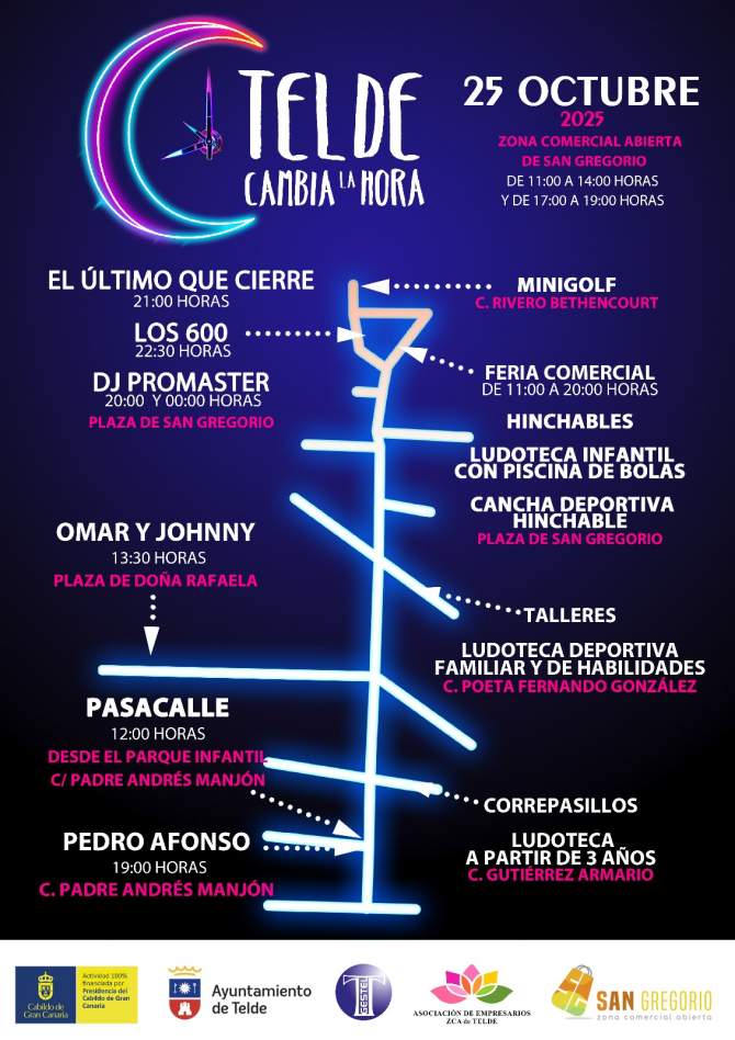 El Ayuntamiento de Telde, mediante la Concejalía de Desarrollo Local, que dirige Nayra Navarro, anuncia una nueva edición de Telde cambia la Hora. La ciudad celebrará el nuevo cambio horario con una feria comercial y un cargado programa de actividades para toda la familia en la Zona Comercial Abierta (ZCA) de San Gregorio. Este proyecto está subvencionado en su totalidad por la Consejería de Presidencia del Cabildo de Gran Canaria, que dirige Teodoro Sosa, por lo que no supone ningún coste para las arcas municipales.