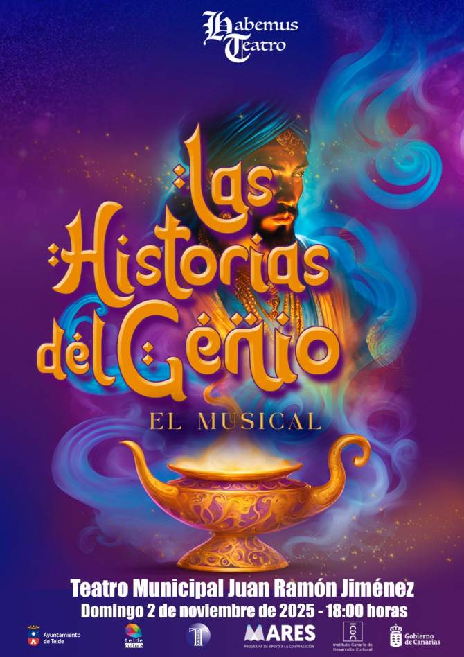 Cartel promocional del musical familiar ¡Las historias del Genio0El Teatro Municipal Juan Ramón Jiménez, en Telde, acogerá este domingo a las 18.00 horas el musical Las historias del Genio, una producción de Habemus Teatro dirigida al público familiar. Las entradas tienen un precio de 8 euros y pueden adquirirse a través de Tu reserva online.