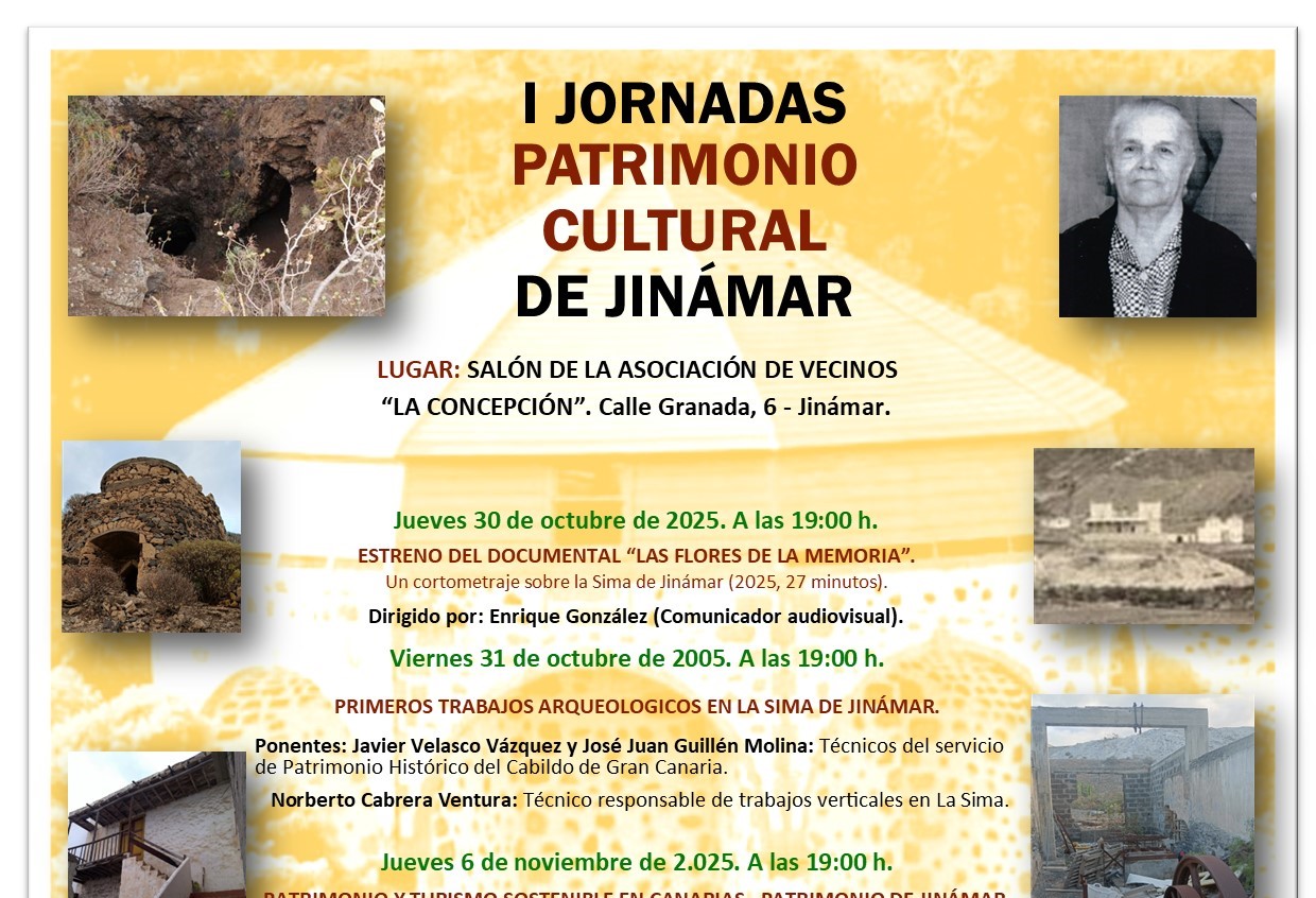 El barrio de Jinámar acogerá desde este jueves, 30 de octubre, las I Jornadas de Patrimonio Cultural, una iniciativa impulsada por la Coordinadora en Defensa del Patrimonio de Jinámar (COPAJI) que busca reflexionar sobre la conservación, el valor histórico y la memoria de los espacios patrimoniales del municipio.