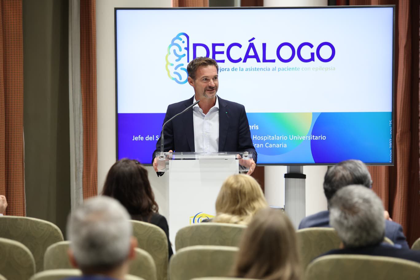 El programa incluyó la proyección del documental Episodios de una vida, que aborda el estigma asociado a la epilepsia a través del testimonio de dos pacientes, Nuria y Arturo, así como la ponencia del Dr. Raúl Amela, jefe del Servicio de Neurología del Complejo Hospitalario Universitario Insular Materno Infantil, quien presentó las principales propuestas de mejora derivadas del estudio EPIPASS y el Decálogo para la optimización de la atención a los pacientes con epilepsia.