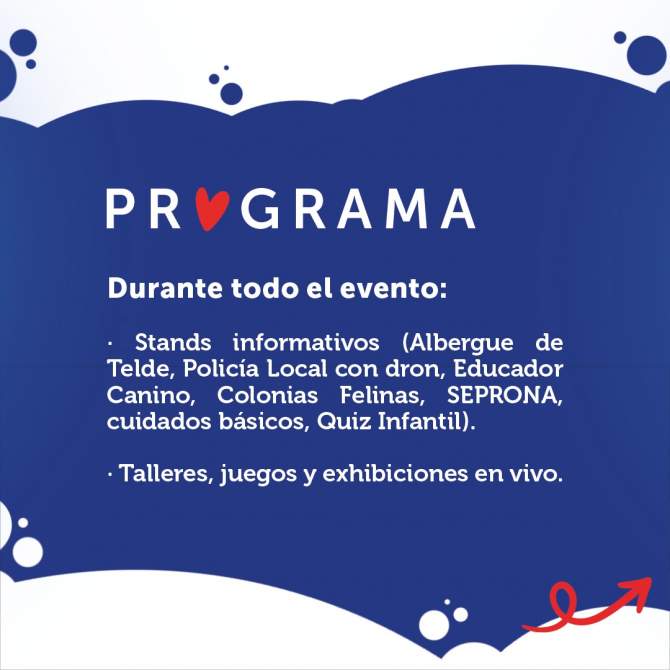 La jornada contará con varios espacios temáticos y actividades ininterrumpidas. Así, habrá 17 stands: Concejalía de Bienestar Animal y Gesplan, con información sobre la gestión del Albergue, adopción y voluntariado; Policía Local, con la Unidad de Drones Unidron, haciendo demostraciones con los mismos; Seprona, informando sobre la legislación relativa a la tenencia de animales y la gestión de denuncias; Brigada Canarias XVI del Ejército de Tierra, con una exhibición canina; Arycan, impartiendo un taller sobre cómo gestionar correctamente colonias felinas; Mi compi de vida (educador canino), con un taller sobre comportamientos de los peludos y cómo ayudarlos; Grupo del Perro de Salvamento de Canarias, mostrando la importante labor de los canes entrenados para la búsqueda de personas desaparecidas; y las protectoras Jinanimals, Tutela Felina Arucas, El alma de Mina, Adopta un amigo en Gran Canaria, Segunda oportunidad - Adopta un rey, Los peluditos de Tori y Mila, Despensa de alimentos para perros y gatos - Gateando, y Ada Gran Canaria, dando a conocer el trabajo que llevan a cabo.
