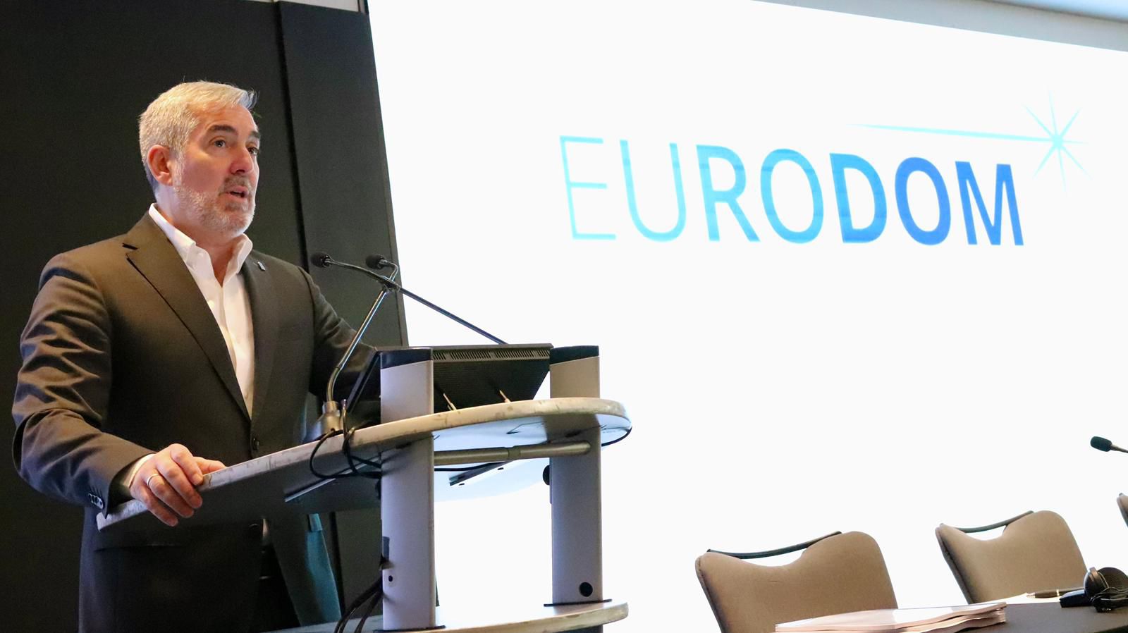El titular del Gobierno autonómico intervino en el acto organizado por Eurodom en dos ocasiones. En primer lugar, abrió la jornada de movilización hablando en nombre de las nueve regiones ultraperiféricas amparadas por el artículo 349 del Tratado de la UE: Canarias, Azores, Madeira, Guadalupe, Martinica, Guayana Francesa, Reunión y Mayotte.