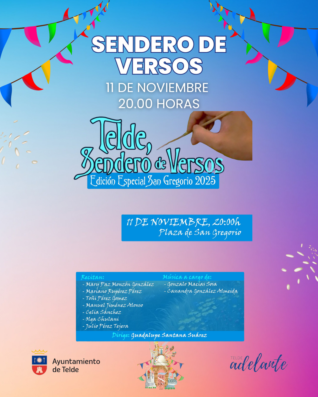 Por su parte, a las 20.00 horas, la plaza de San Gregorio se convertirá en el epicentro de la lírica con un recital de poesía Senderos de Versos: Edición Especial San Gregorio, dirigido por Guadalupe Santana, desde las 20.00 horas. Los Llanos se convertirá en un escenario de emotividad, ternura y pasión con los poemas que recitarán Mary Paz Monzón, Mariano Rupérez, Toñi Pérez, Manuel Jiménez, Celia Sánchez, Olga Chulani y Julio Pérez. La música correrá a cargo de Gonzalo Macías y Cassandra González.
