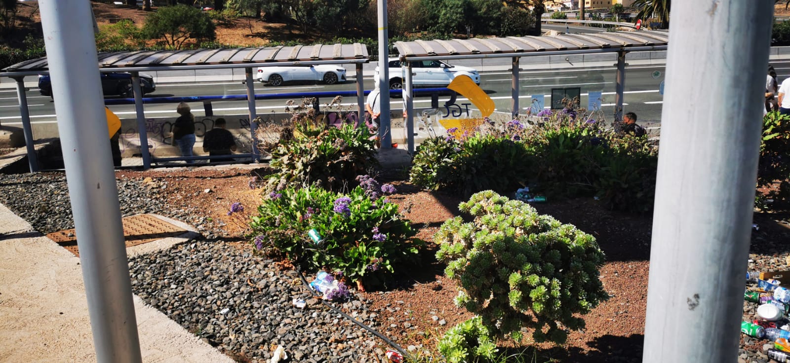 Vecinos y usuarios del transporte público han denunciado el estado de abandono y acumulación de residuos en la parada de guaguas del Cruce de Melenara, en dirección a Las Palmas de Gran Canaria. Según señalan, la situación se mantiene desde hace varios meses, con papeleras desbordadas y desperdicios dispersos por el entorno ajardinado junto a la carretera GC-1.