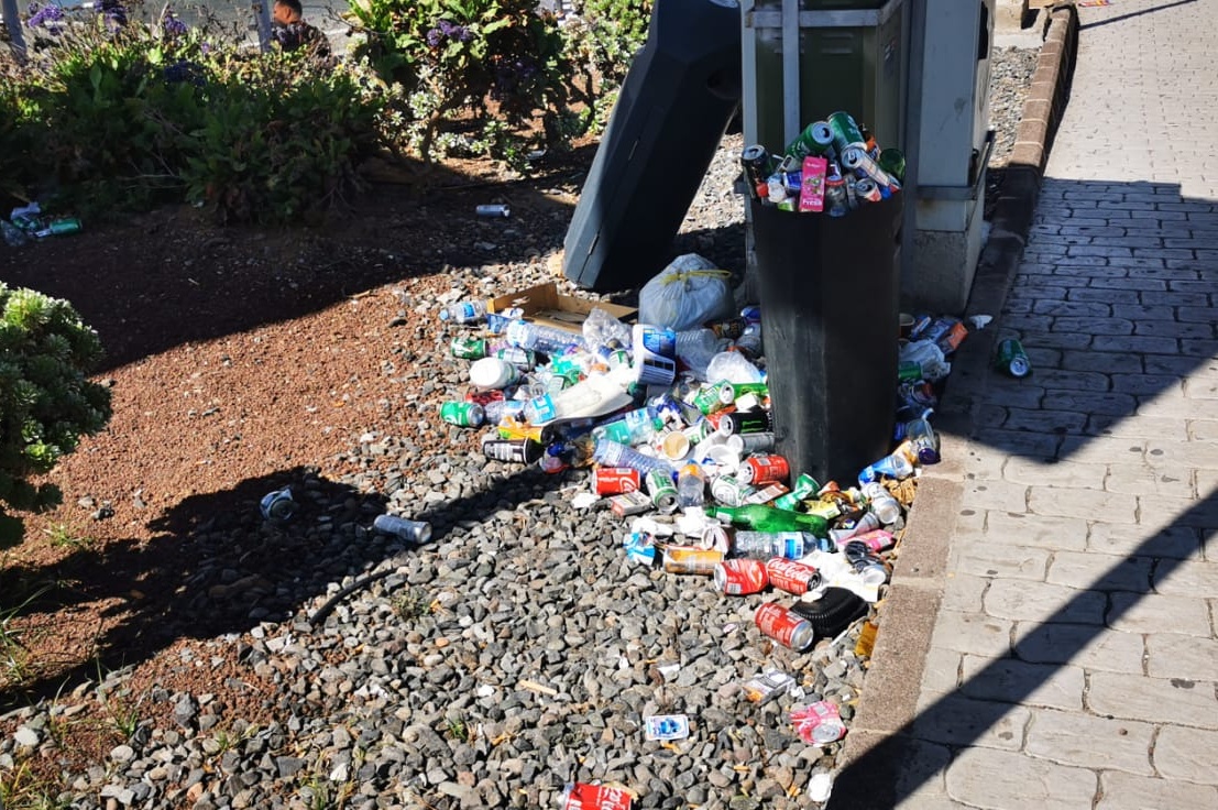 En las imágenes remitidas puede observarse una gran cantidad de latas, envases y restos plásticos en la zona peatonal y en los parterres del entorno. Los vecinos reclaman una actuación de limpieza y mantenimiento en este punto, utilizado diariamente por numerosos viajeros.