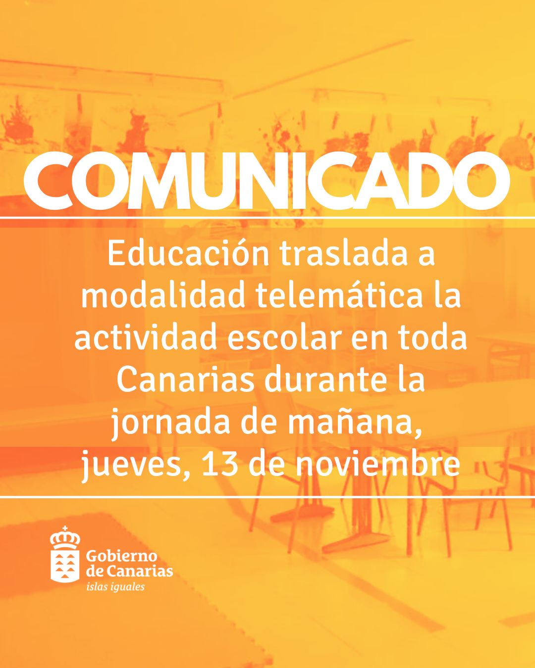 La Consejería de Educación, Formación Profesional, Actividad Física y Deportes del Gobierno de Canarias ha anunciado este miércoles la suspensión total de la actividad lectiva presencial en todas las islas este jueves, 13 de noviembre, como medida preventiva ante el empeoramiento de las condiciones meteorológicas provocadas por la borrasca Claudia.