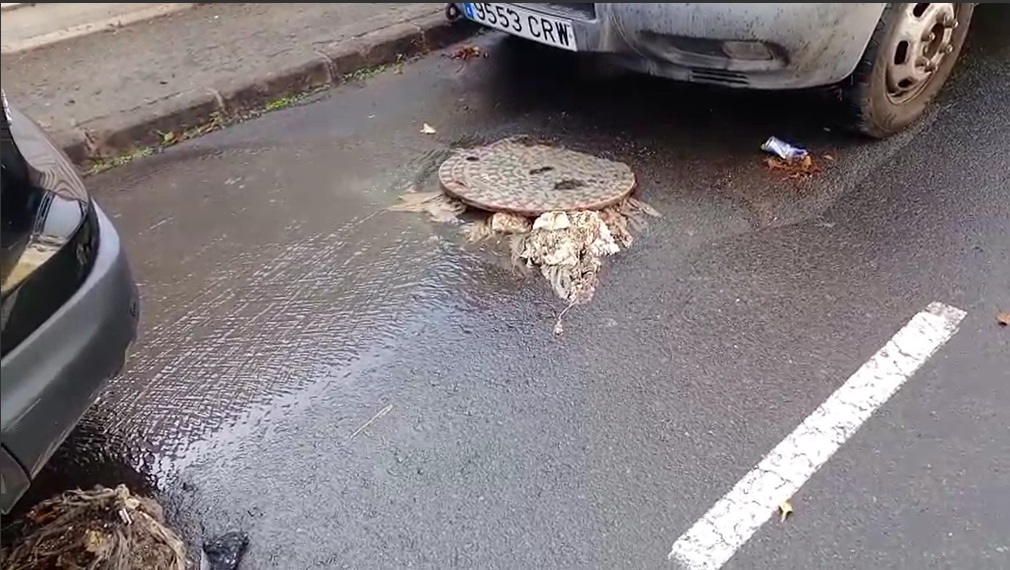 Las imágenes remitidas muestran una arqueta situada en la calle Fray Luis de León expulsando agua sucia al exterior, lo que ha provocado la formación de charcos y residuos acumulados alrededor de la tapa del alcantarillado.