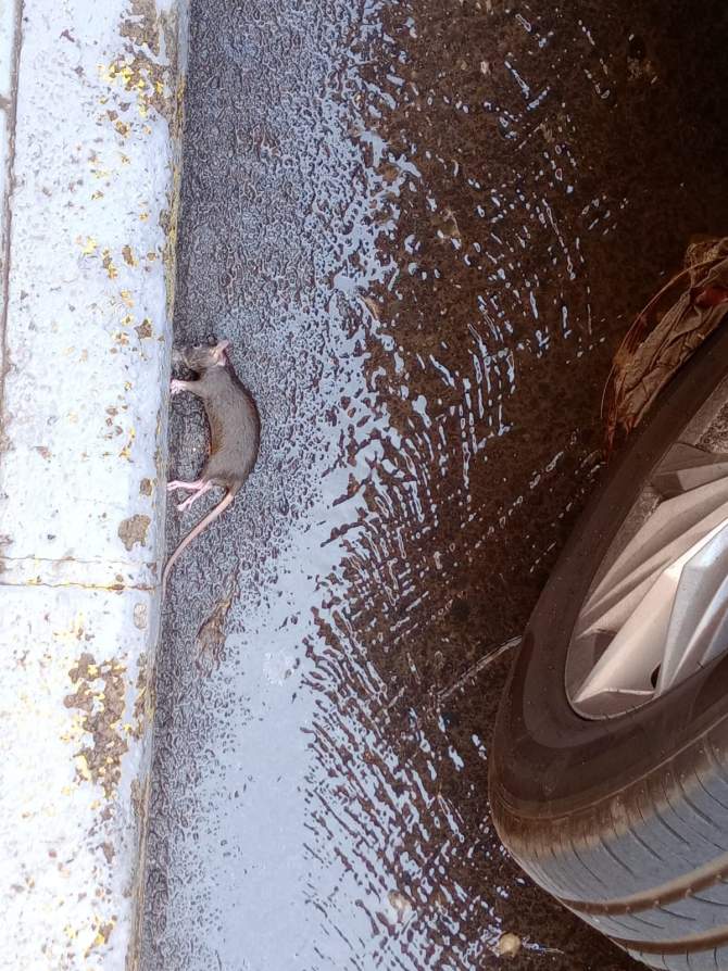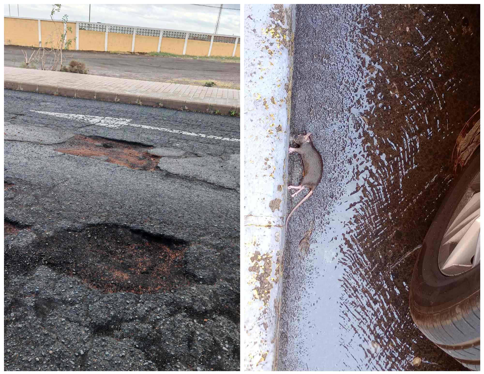 En las fotografías también se observa la presencia de un roedor muerto sobre la calzada, así como restos arrastrados por la fuga. Los residentes afirman que este problema se repite desde hace años, incluso en días sin lluvias, y que la situación afecta al entorno inmediato de viviendas y vehículos estacionados.