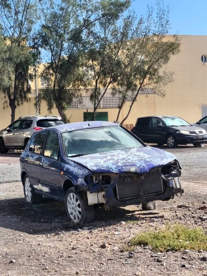 En la imagen remitida se observa un turismo con evidentes desperfectos: la parte frontal carece de parachoques, faros y otros elementos de carrocería, y la pintura del capó y del techo presenta un deterioro notable.