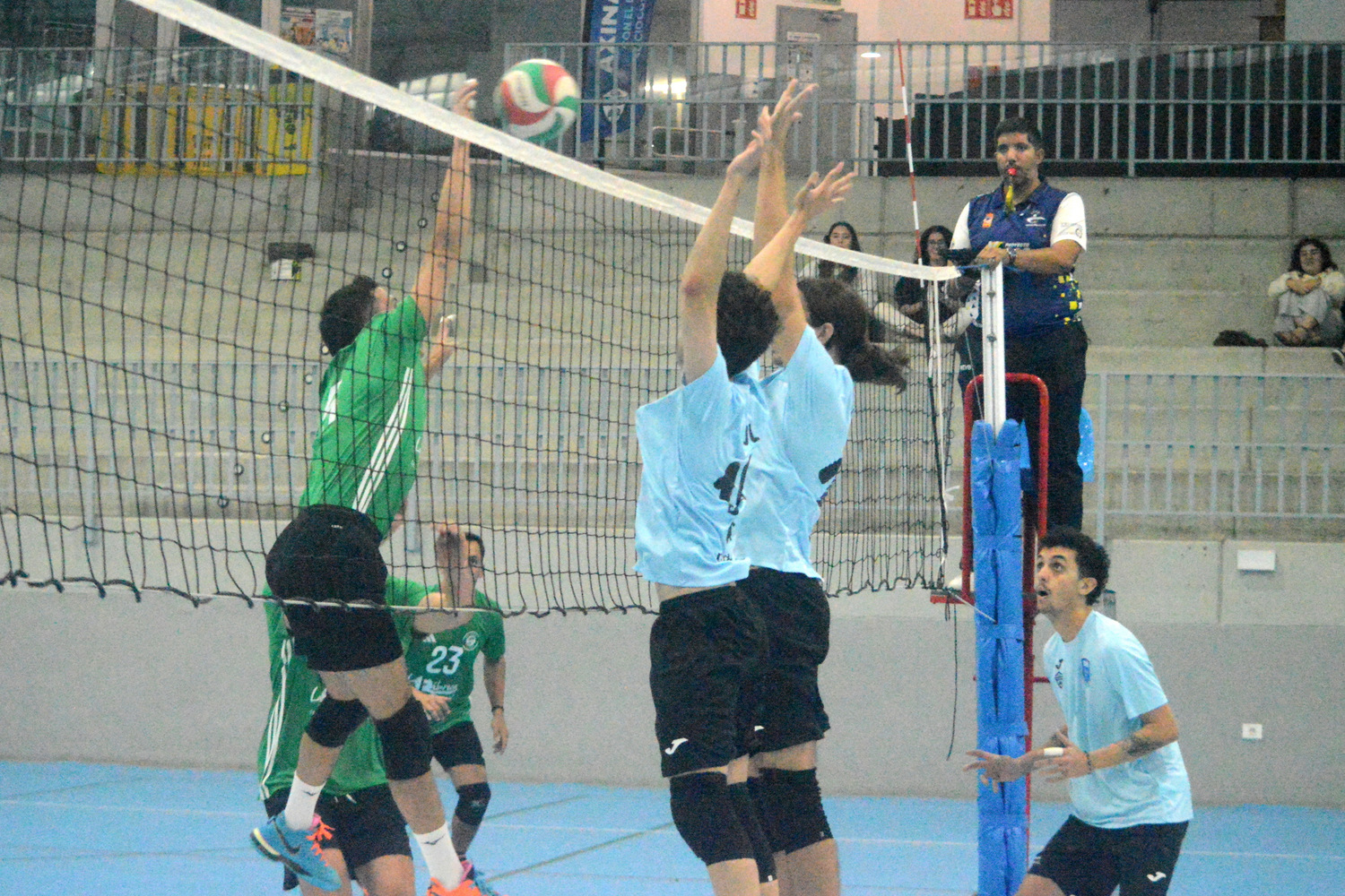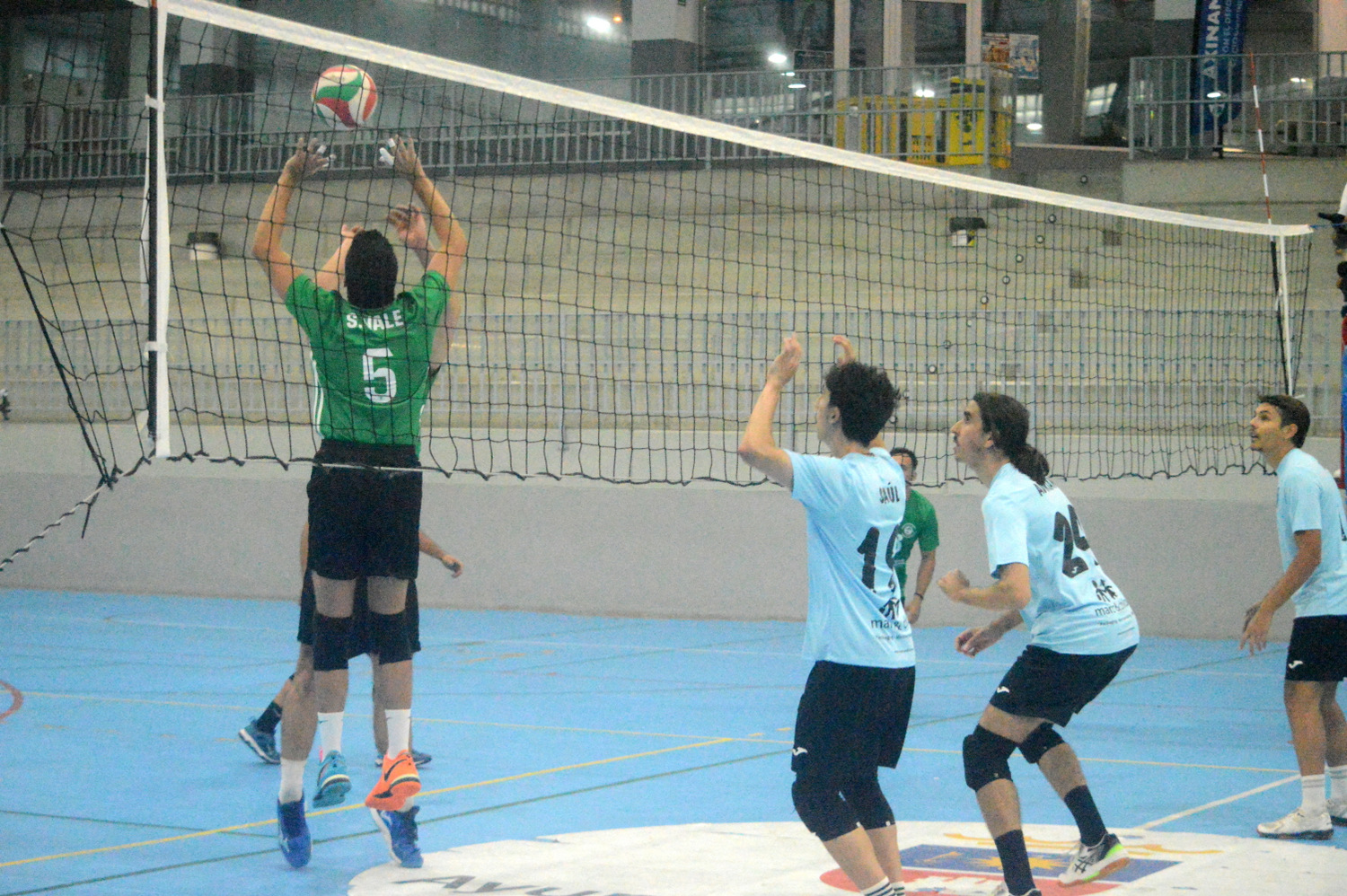 Saúl Rodríguez llega tarde a un bloqueo (Foto: Juan Antonio Hernández)El CD Alhambra Axinámar perdió este sábado por 0-3 (11-25, 12-25 y 11-25, 65 minutos de partido) ante el CV La Victoria (segundo clasificado) en el pabellón Juan Carlos Hernández en la quinta jornada de la Liga Canaria Sénior, donde los teldenses confirmaron mejorías pero muy lejos de obtener al menos un set.