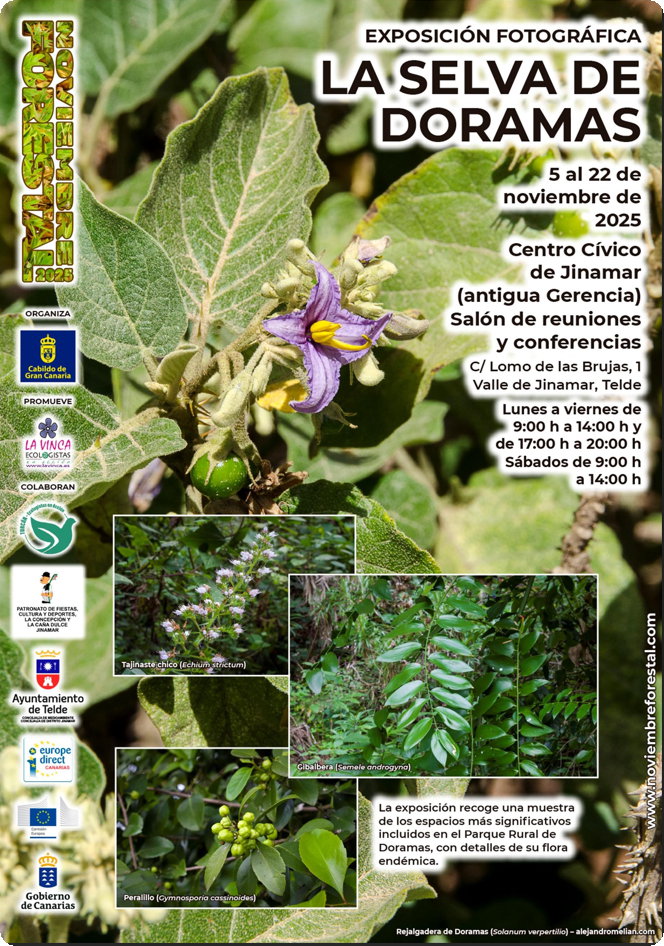 Turcón Ecologistas en Acción participa este mes en Noviembre Forestal 2025 colaborando en la dinamización de la exposición divulgativa “La Selva de Doramas”, inaugurada en el Centro Cívico de Jinámar y abierta al público desde el 5 hasta el 22 de noviembre. La muestra, obra del fotógrafo canario Marcos Martín, se integra por dieciocho paneles que retratan paisajes, rincones y especies vegetales del Parque Rural de Doramas, uno de los últimos refugios de la laurisilva en Gran Canaria.