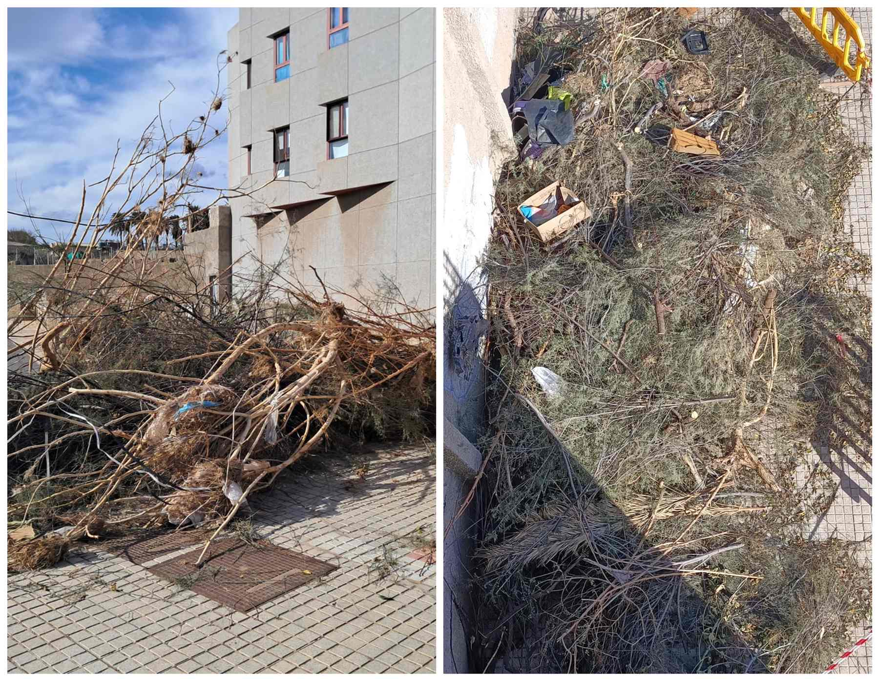 La acumulación de ramas procedentes del barranco se había generado tras las labores de limpieza urgente ante la alerta meteorológica, pero el depósito quedó sin recoger hasta hoy, generando inquietud en el vecindario por su potencial peligro.