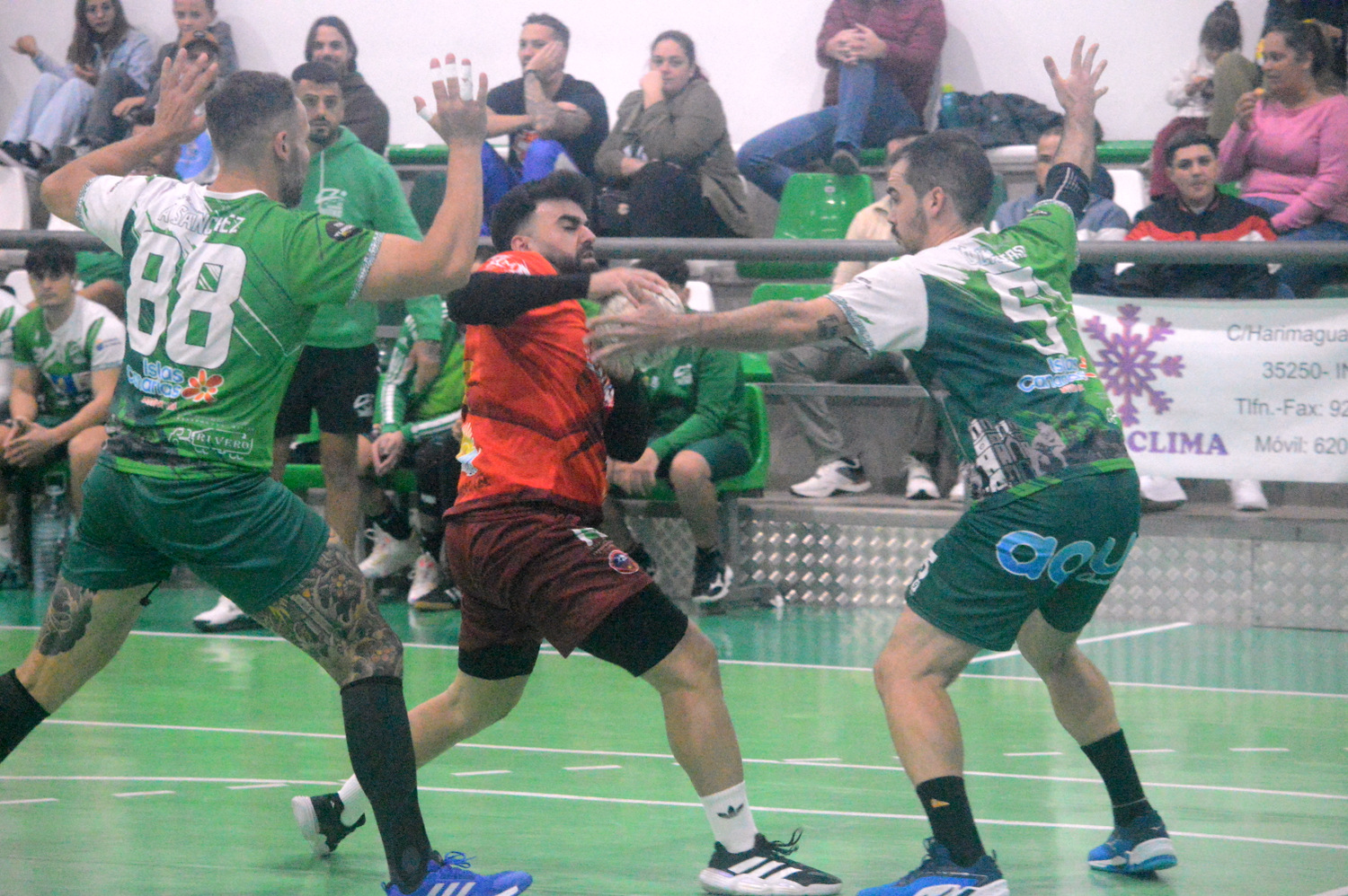 Otro tanto de Sánchez en el 39 en una rápida transición obligó a Kevin Armas a solicitar tiempo muerto, más impotente por el arbitraje que por el propio juego de su equipo. Entonces aparecieron tres nombres: Nairobi Armas, Alejandro Tendero y Alberto Medina, quien ya ha (mal)acostumbrado a la afición con sus paradas. Josimar Martín fue el que luego tuvo que asumir el liderato anotados por la defensa individual que sufrió Armas por parte de Aitor Araña.
