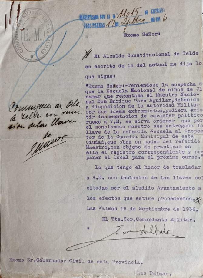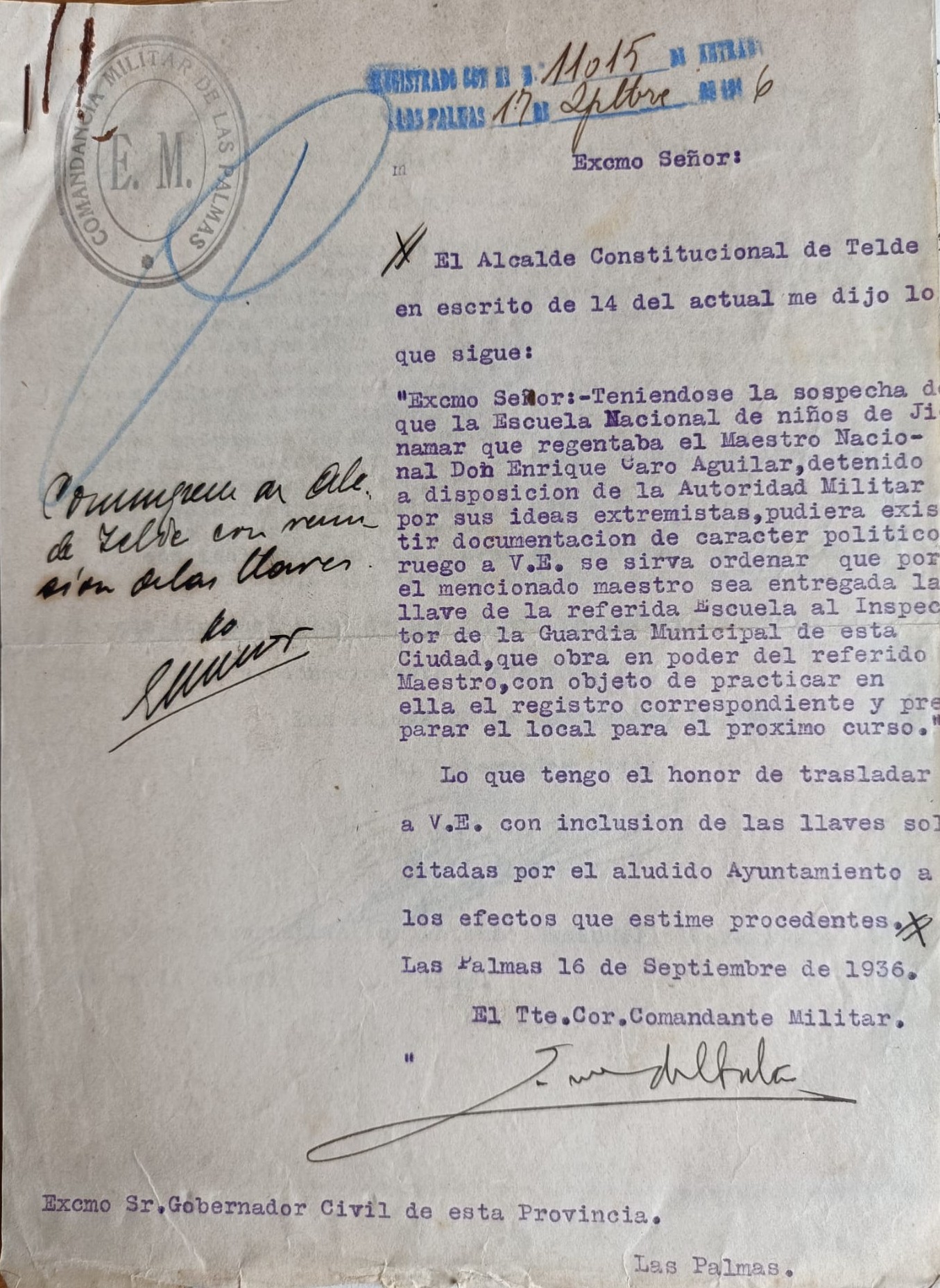 Dos meses antes de que accedieran y registraran la escuela, el 18 de julio del 36 se produjo el Golpe de Estado. Ese día, el maestro Caro no acudió a su puesto de trabajo. Según dijo, se encontraba enfermo. Fue al trasladarse al Ayuntamiento de Telde para justificar su ausencia cuando los de Falange procedieron a su detención.