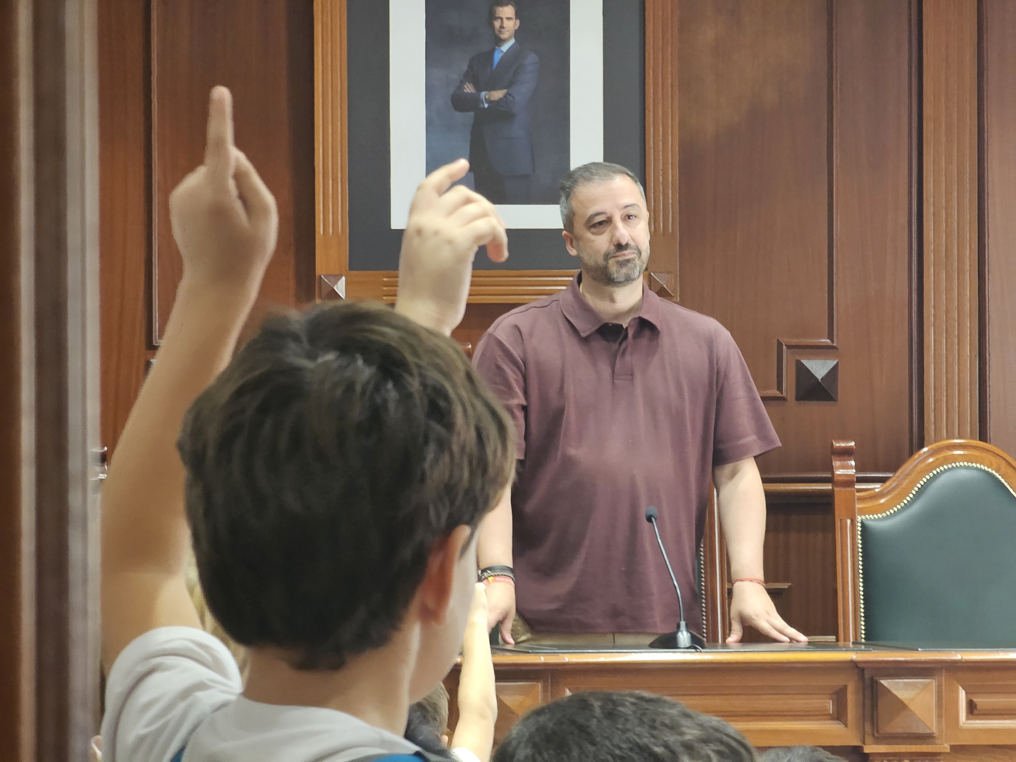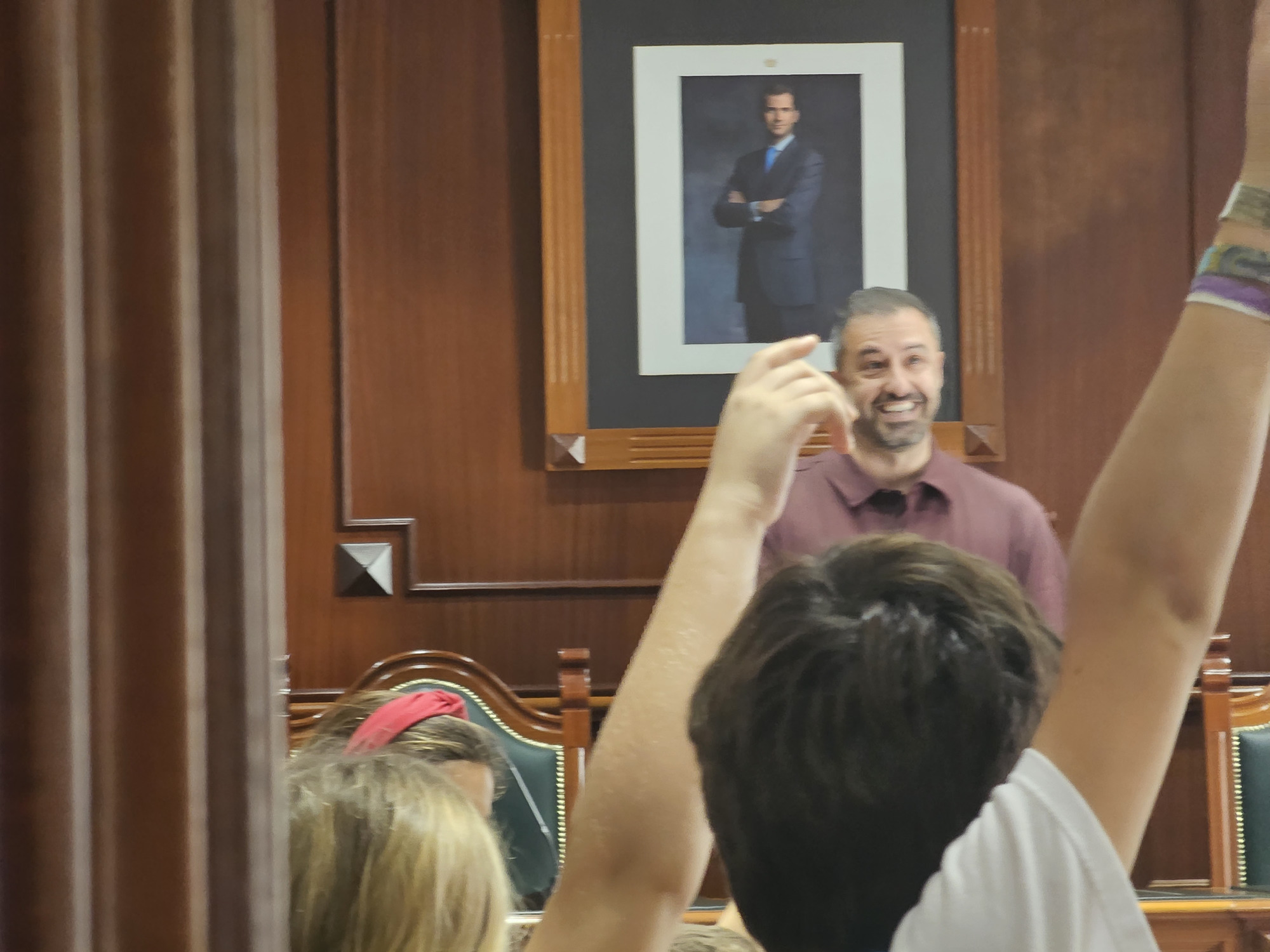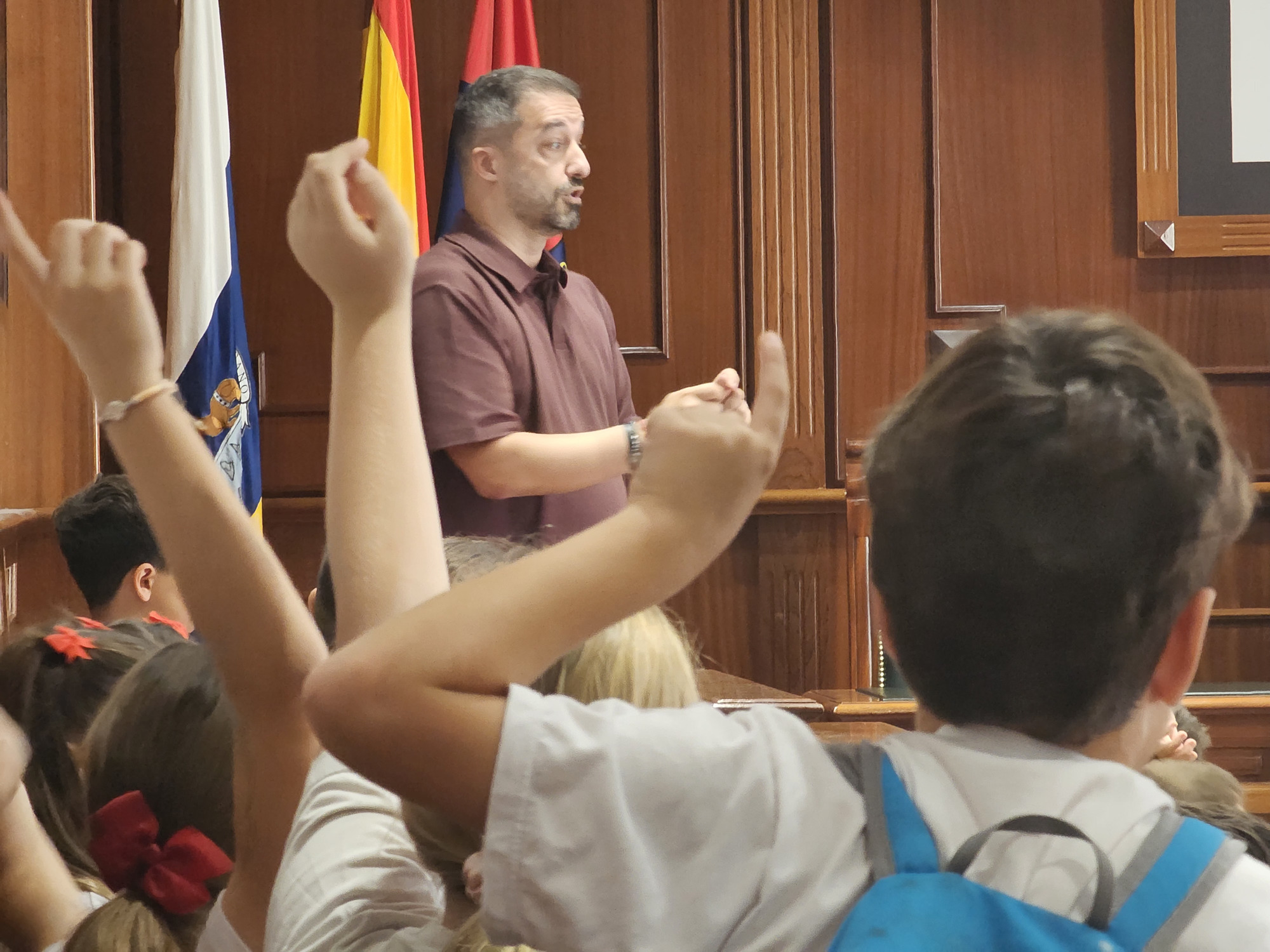 Entre sonrisas, un ambiente cargado de ilusión y abrazos sinceros, los niños y niñas tomaron asiento en el Salón de Plenos del edificio municipal para escuchar las explicaciones del regidor sobre las principales características del espacio y la historia de cada detalle que lo conforman, tal y como hicieron a la inversa los alumnos, en su día, en el colegio.
