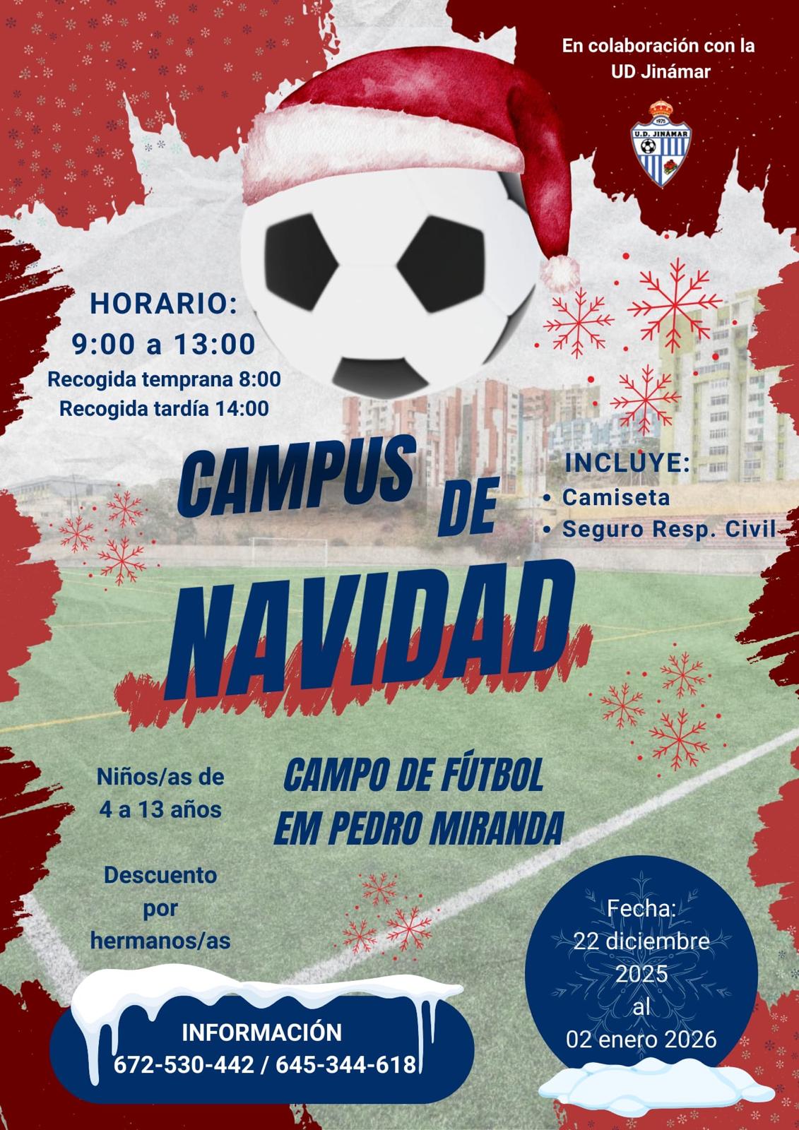 Cartel del campus de NavidadEl campo de fútbol Pedro Miranda acogerá del 22 de diciembre al 2 de enero un campus de Navidad dirigido a niños de entre 4 y 13 años que se desarrollará en colaboración con la UD Jinámar.