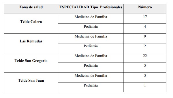 En cuanto a la cantidad de facultativos que integran los centros de salud teldenses, tanto en médicos de familia como en pediatras, existe una coincidencia en el orden según número de pacientes. Esto es: San Gregorio, Calero, Jinámar, Remudas y San Juan. En la zona de los Llanos trabajan 22 médicos de familia y 5 pediatras, en el Calero 17 médicos para adultos y 4 para infantes, en Las Remudas cuentan con 9 y 2 respectivamente, mientras que en San Juan existen 5 médicos de familia y sólo 1 pediatra. Caso aparte lo hallamos en el CS Jinámar. Aquí constan 14 facultativos para la población que supera los 16 años y 4 médicos pediátricos, con la peculiaridad de que una de estas profesionales es “compartida”, dos días a la semana, con el Consultorio Local de Marzagán.
