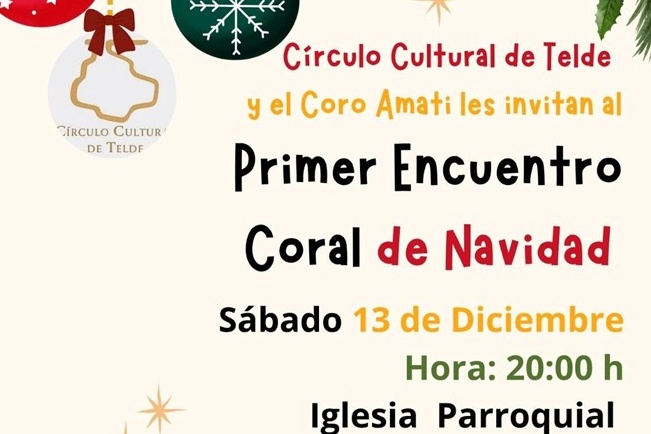 El Círculo Cultural de Telde y su agrupación vocal Amati celebrarán el sábado 13 de diciembre, a las 20.00 horas, el I Encuentro Coral de Villancicos en la iglesia de San Gregorio Taumaturgo, el cual reunirá a varias formaciones corales y agrupaciones instrumentales de distintos municipios.