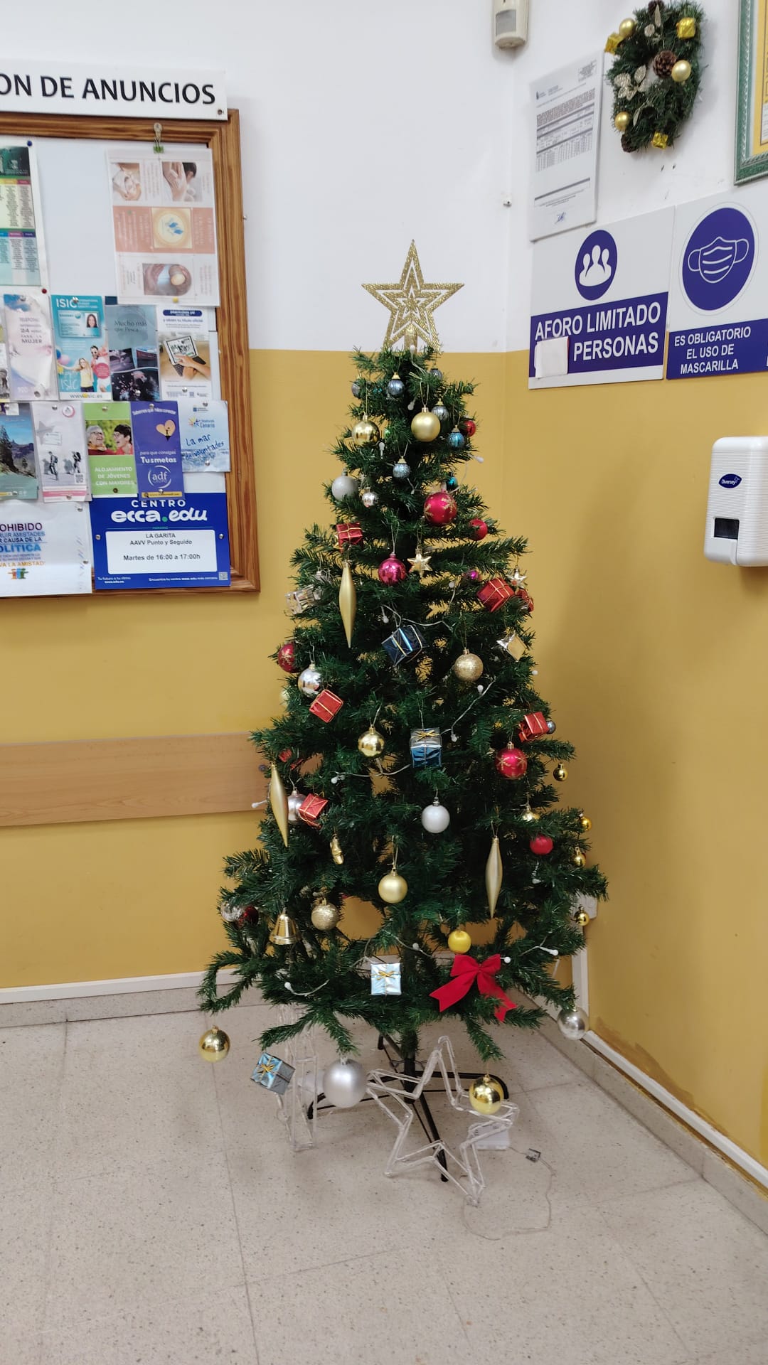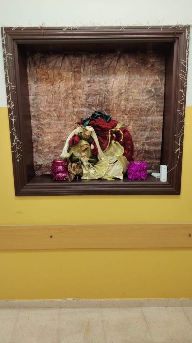 En el interior del local destaca un árbol decorado con adornos dorados, rojos y plateados, acompañado de guirnaldas luminosas. A pocos metros, un belén de estilo artesanal preside uno de los rincones más visibles del espacio, aportando un toque tradicional a la ambientación festiva.