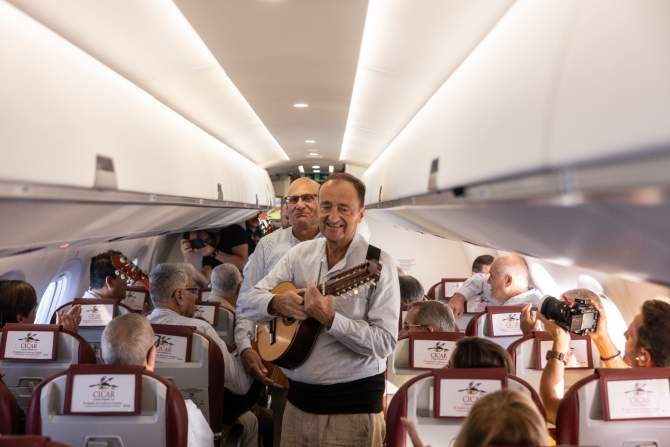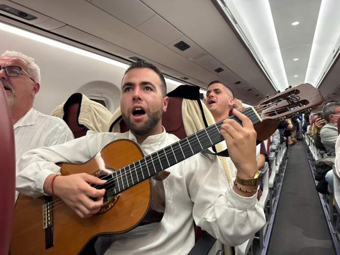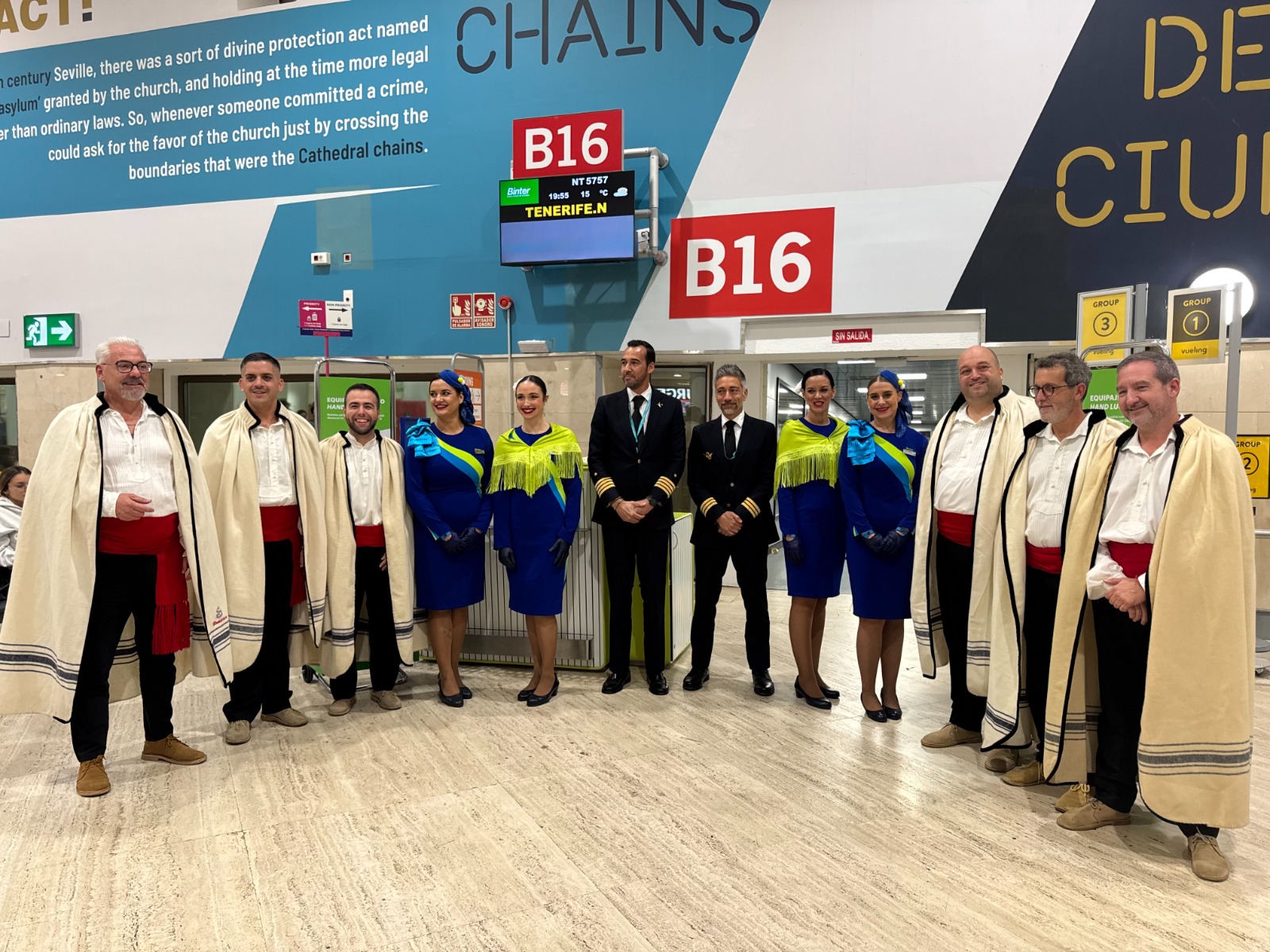 Binter celebró la inauguración de sus nuevos vuelos que conectan los aeropuertos de Tenerife Norte y Gran Canaria, respectivamente, con Sevilla con una sorpresa muy especial a bordo. Integrantes de Los Sabandeños y Los Gofiones acompañaron a los pasajeros, ofreciendo un ambiente festivo y una muestra del folclore canario.