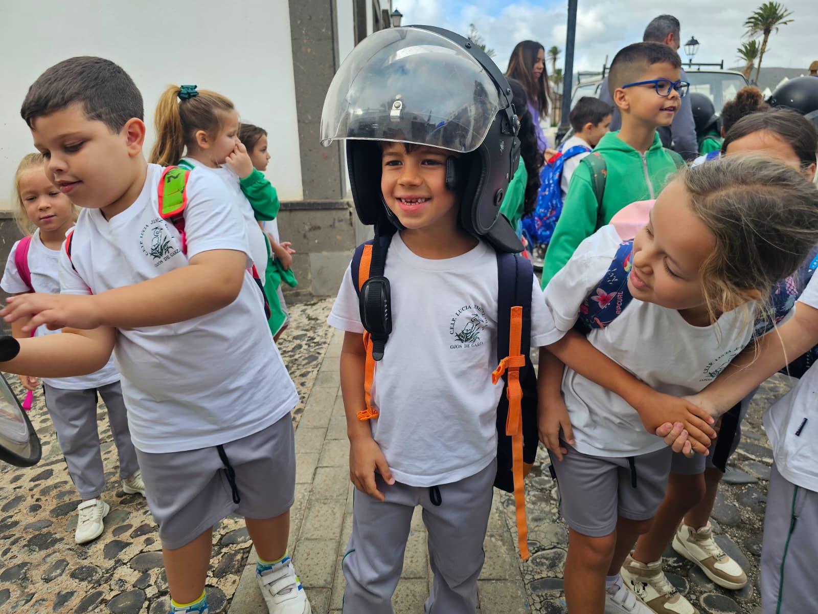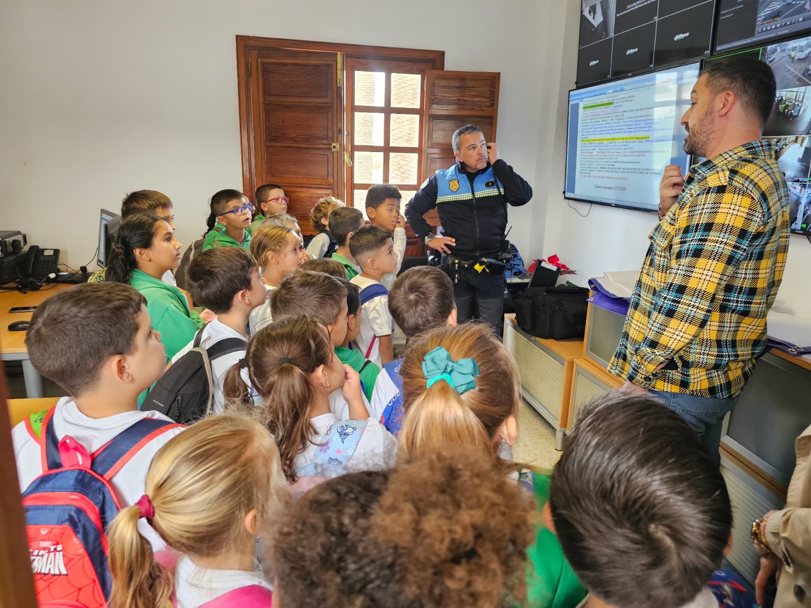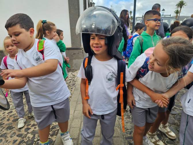 Tras el encuentro en las Casas Consistoriales, el grupo, junto a sus profesoras y la directora del colegio, Inés Pulido, también concejala de la oposición de la corporación teldense, se dirigió a la Policía Local, donde Juan Antonio Peña hizo de guía por cada una de las dependencias de la Jefatura. Allí, los pequeños y las pequeñas no solo fueron testigos en directo de un accidente sin gravedad, a través de una de las cámaras de control y seguridad ubicadas en la ciudad, que se reproducen en la comisaría, sino que, entre otras actividades, montaron en los coches oficiales y usaron cascos y escudos del cuerpo, pasando de ser alcaldes y alcaldesas a convertirse en agentes locales.