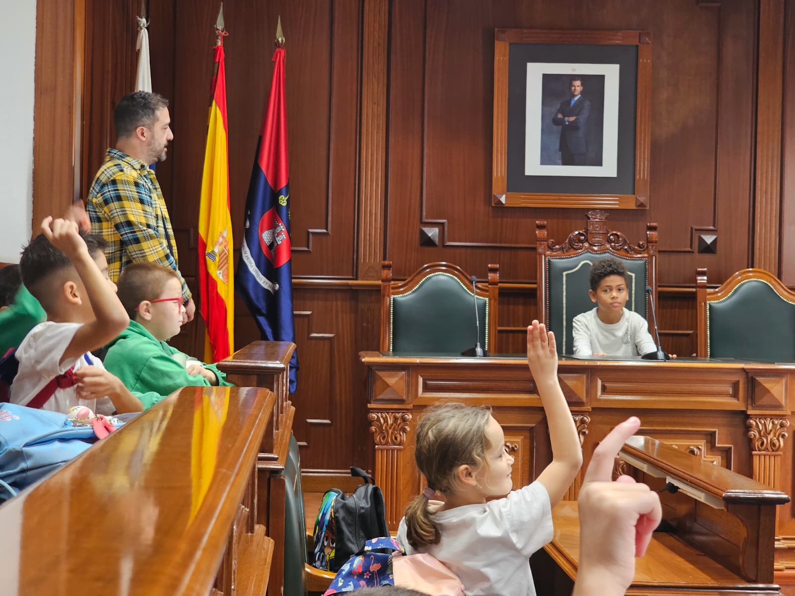 Las Casas Consistoriales fueron testigo, durante la mañana de este jueves, de cómo las alumnas y los alumnos de 1º y 2º de Primaria del CEIP Lucía Jiménez Oliva, natural de Ojos de Garza, se convirtieron en alcaldesas y alcaldes de Telde por un día. El regidor de la ciudad, Juan Antonio Peña, los recibió en el Salón de Plenos, donde, uno por uno, fueron dejando sus asientos de concejales para ocupar el del primer edil; la ocasión perfecta para manifestar qué creen que necesita el municipio para mejorar, ante los votos a favor o en contra de sus compañeros y compañeras. Así, aprendieron cómo funcionan las sesiones de Pleno y el Ayuntamiento, entre otros datos de interés.