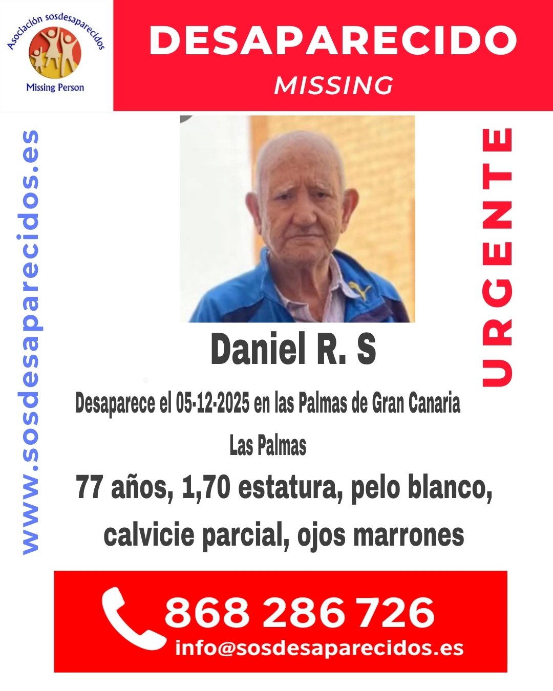 La asociación SOS Desaparecidos ha activado una alerta urgente para localizar a Daniel R. S., un hombre de 77 años desaparecido este 5 de diciembre de 2025 en Las Palmas de Gran Canaria. Según el cartel difundido por la organización, el vecino mide 1,70 metros de estatura, tiene pelo blanco, calvicie parcial y ojos marrones.