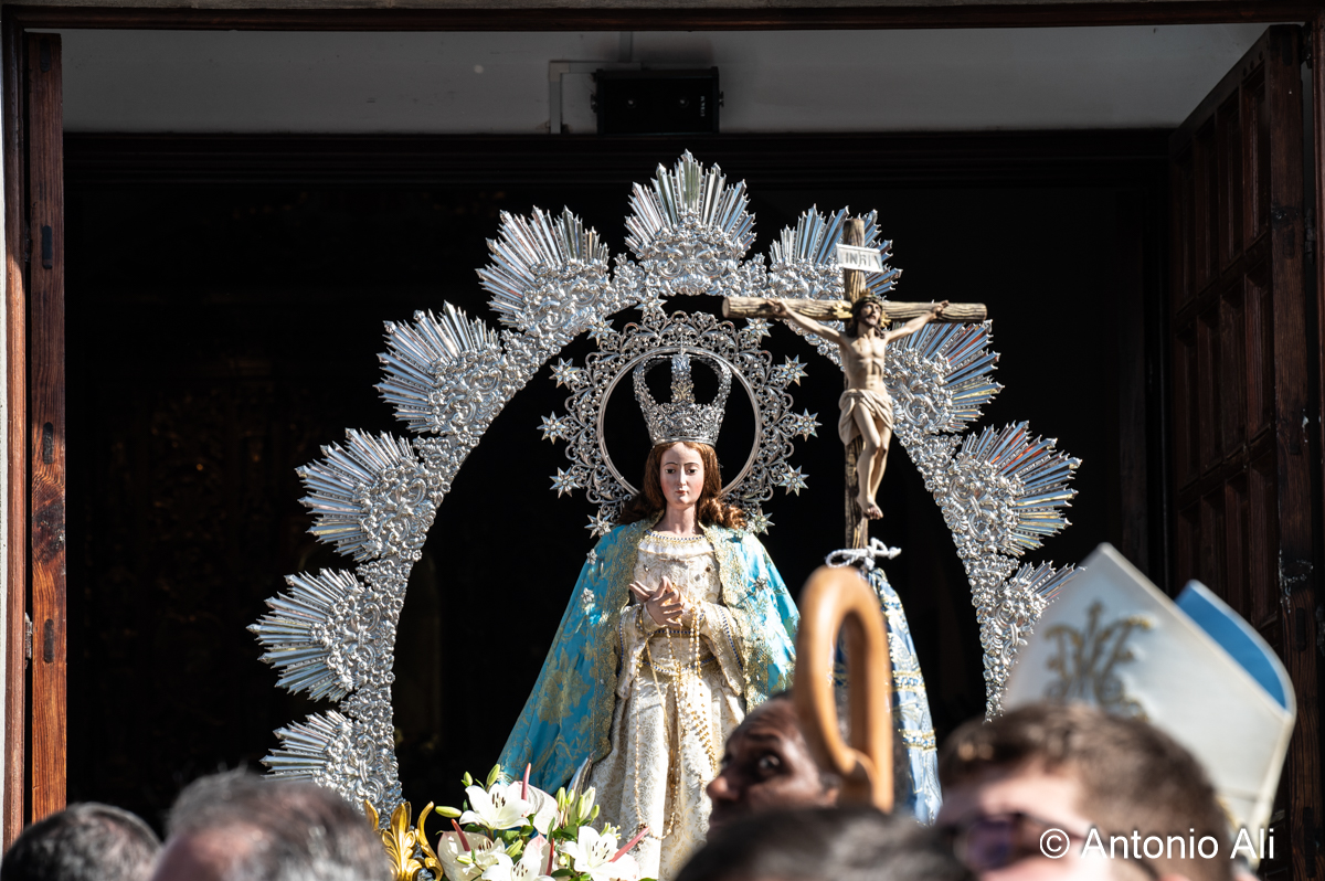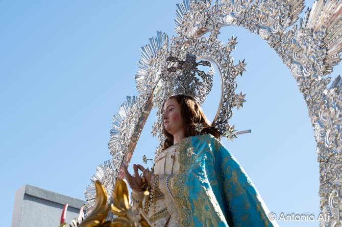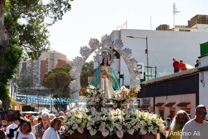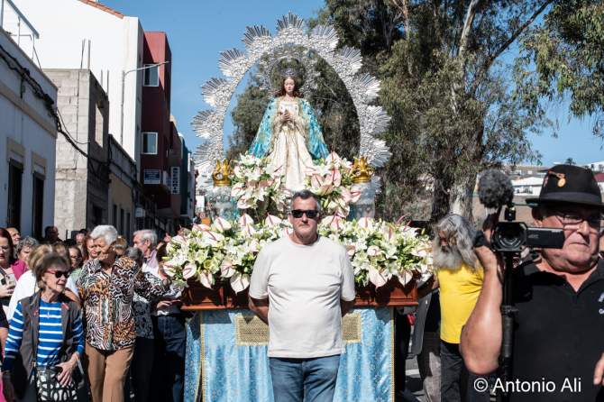 Salida de la Inmaculada Concepción de María (Foto: Antonio Alí)La Inmaculada Concepción de María regresó este lunes a su cita anual con los feligreses de Jinámar que llenaron la carretera general del barrio para acompañar la imagen en procesión tras la misa solemne del mediodía en el Santuario Diocesano.