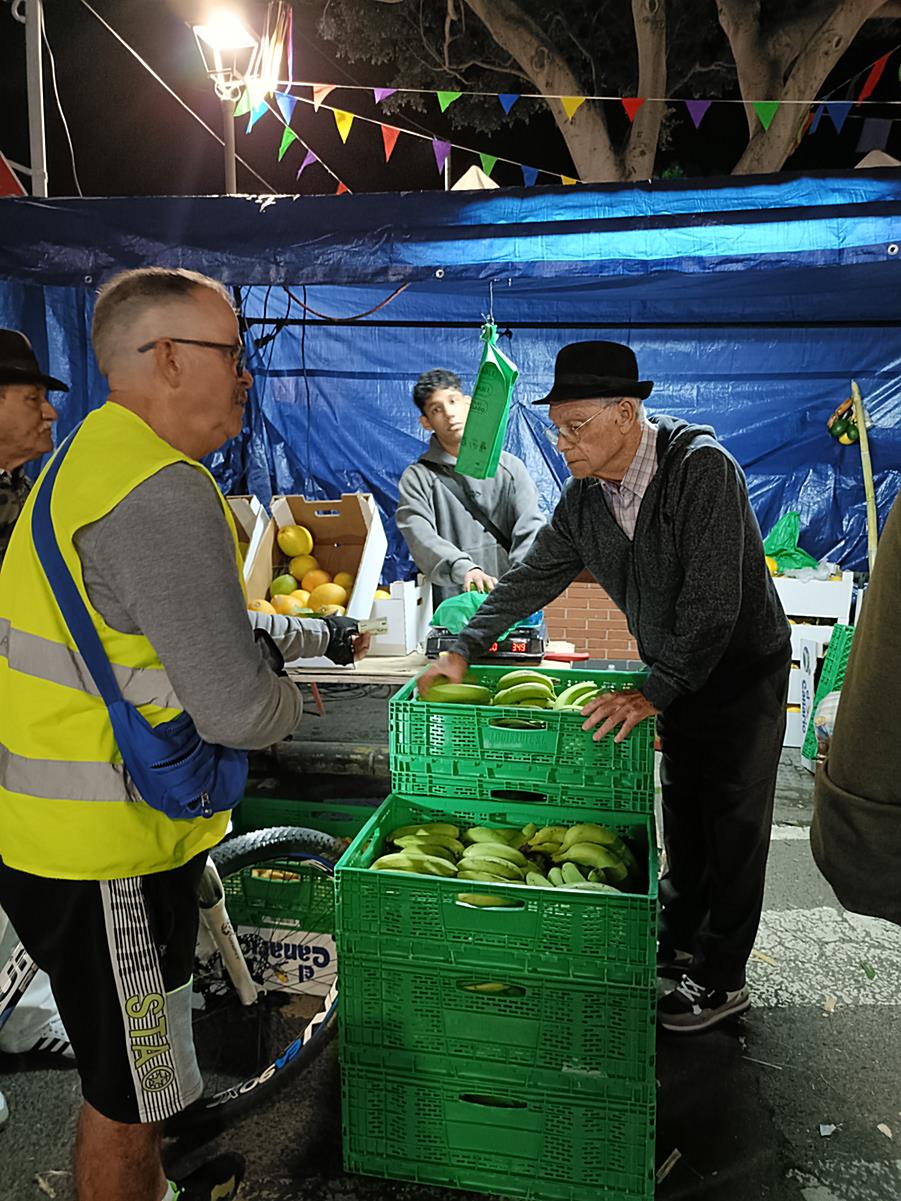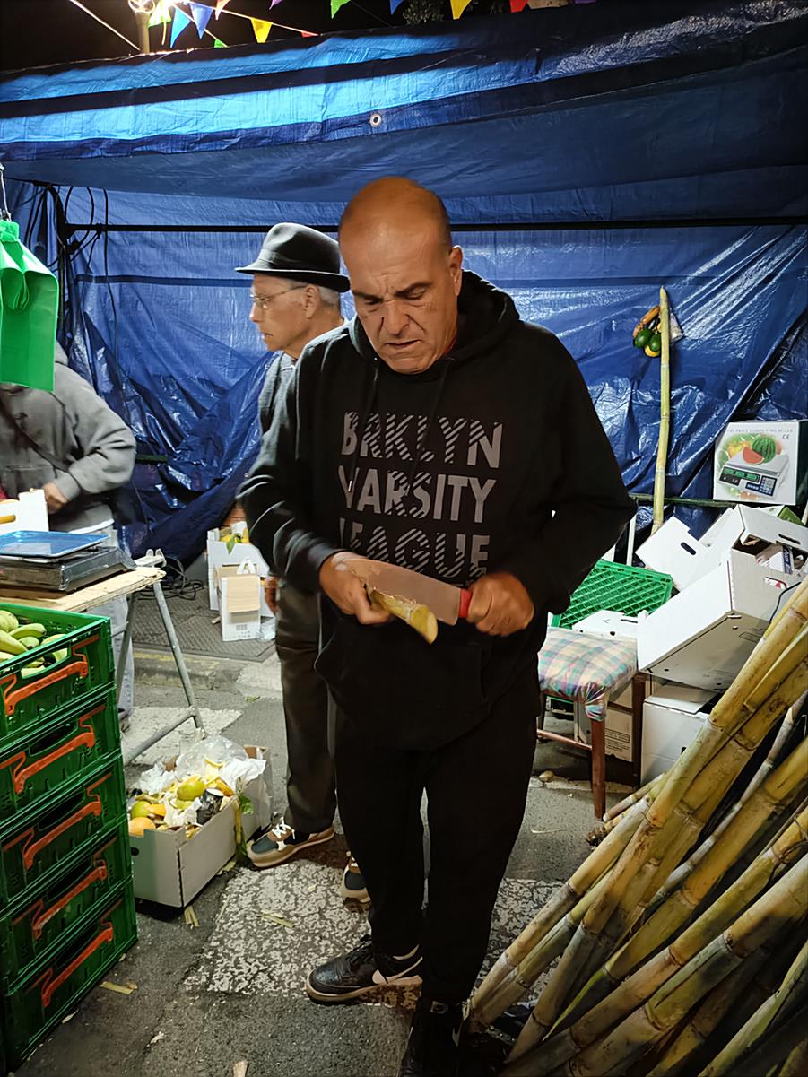 Ángel José no sólo lleva caña de azúcar. También vende frutas: naranjas procedentes de Pozo Izquierdo, aguacates del Barranco de Telde, plátanos de Sardina de Gáldar, entre otras. Echándole una mano se encuentra Juan Sosa. El señor, de 77 años, recuerda que “en los buenos tiempos”, cuando la carretera era de tierra, se llegaban a montar hasta 50 puestos de caña dulce. “¡Se traía hasta de Mogán! Estaba esto llenísimo”, apunta Ángel. Al joven se le iluminan los ojos cuando habla de Paco Torres, los Barranquera y los Machango. “A esta fiesta venía caña del Caracol, incluso un hombre de La Palma que se ponía a hacer zumo con ella”. Preguntado por las tradiciones que se siguen manteniendo, cuenta que hay personas que le traen un trocito de caña seca del año anterior y lo cambian por uno nuevo. “También hay quien se lleva doce nudos, uno por mes, y lo pone detrás de la puerta. Dicen que da suerte”.